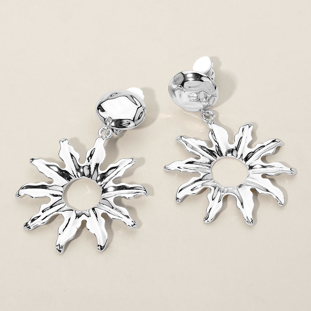 Details • Size : 2" X 2.8" • Clip On • Statement clip-on drop earrings featuring an abstract sunburst design with sculptural petal details. Lightweight and comfortable for non-pierced ears, these eye-catching earrings add artistic flair to everyday looks, resort wear, or special occasion styling. • Lead and Nickel Compliant