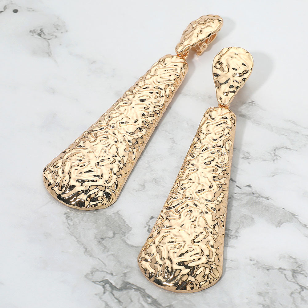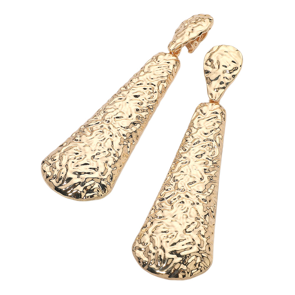 Details • Size : 1.25" X 4.5" • Clip On • Stylish long textured clip-on drop earrings designed with a unique hammered finish for modern appeal. Lightweight and comfortable, these earrings are perfect for non-pierced ears, adding bold elegance and a statement look to both casual outfits and evening wear. • Lead and Nickel Compliant
