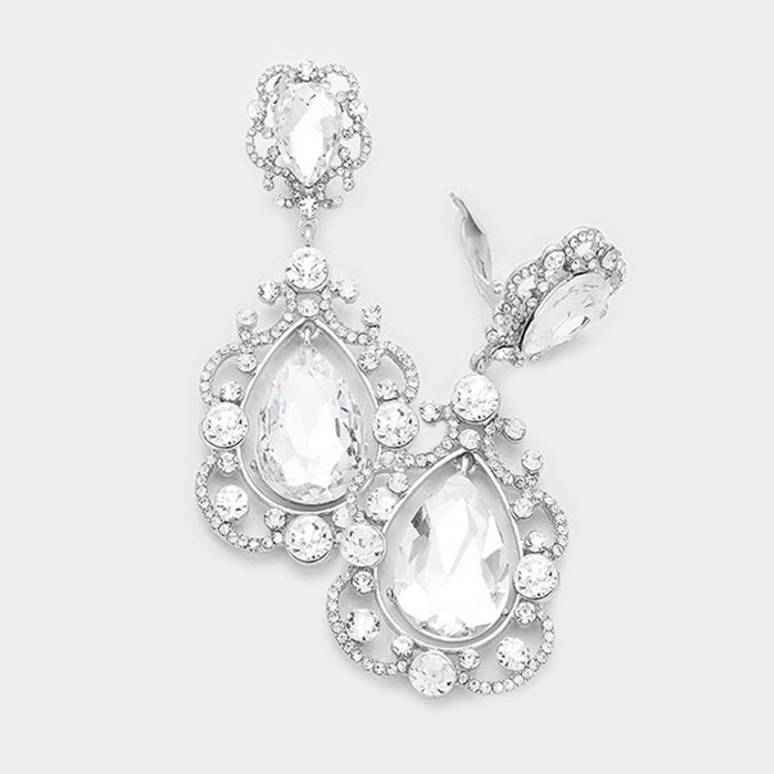 Floral Crystal Teardrop Clip On Evening Earrings