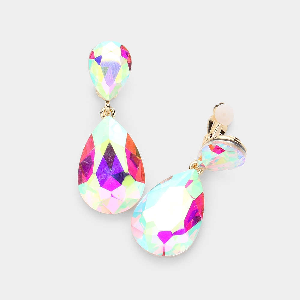 Glass Crystal Double Teardrop Clip on Evening Earrings