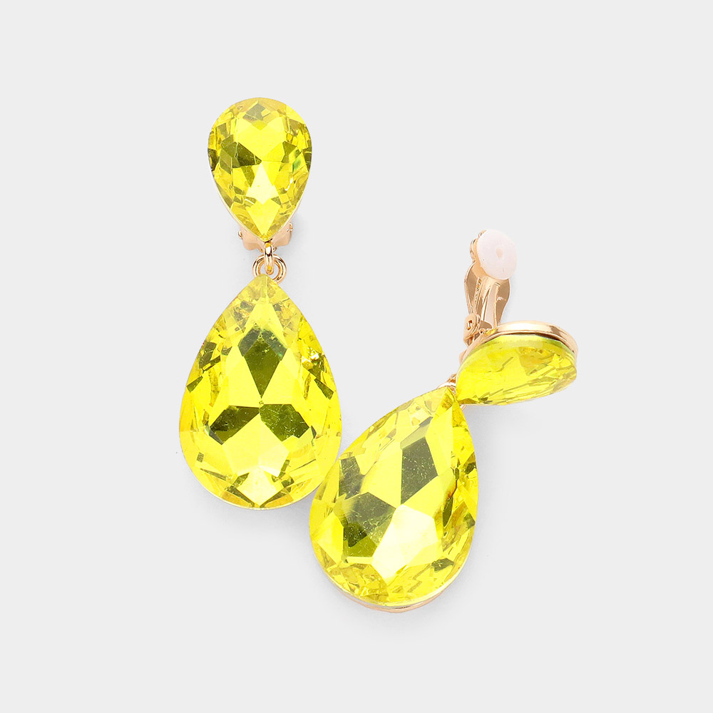 Glass Crystal Double Teardrop Clip on Evening Earrings