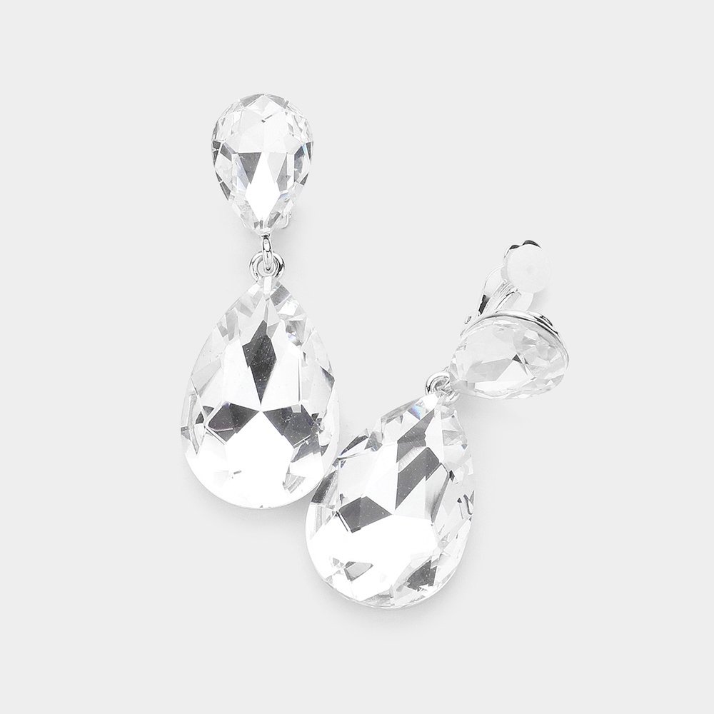 Glass Crystal Double Teardrop Clip on Evening Earrings