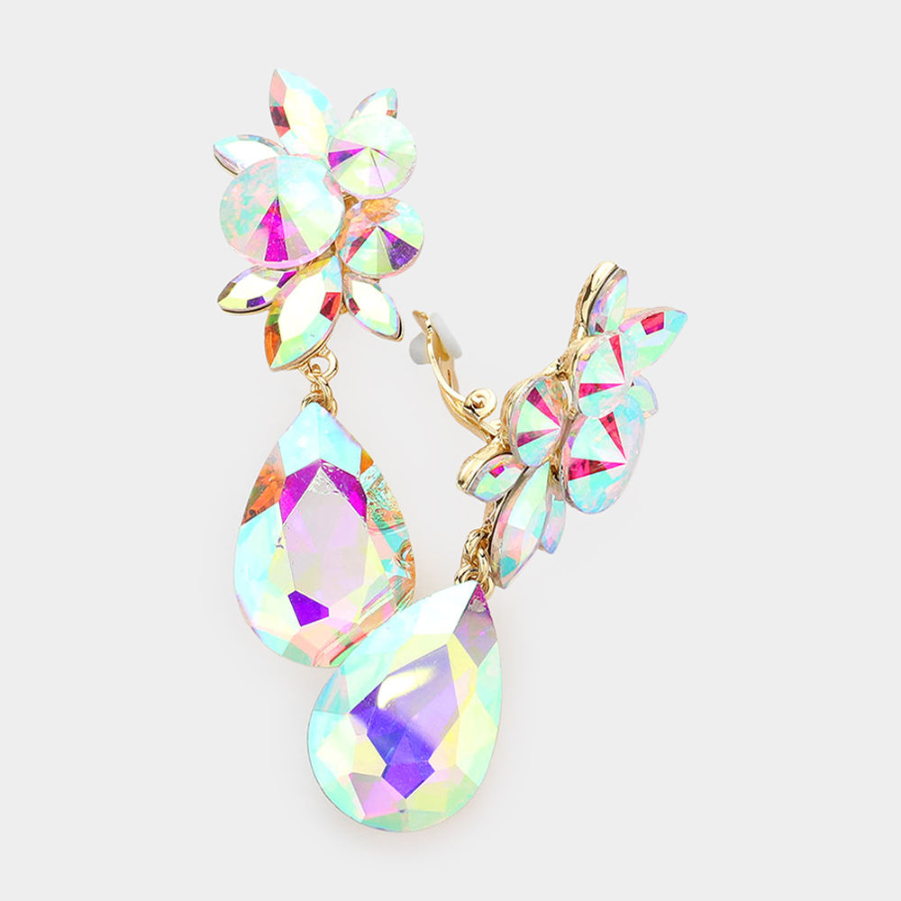 Glass Crystal Double Teardrop Clip on Evening Earrings