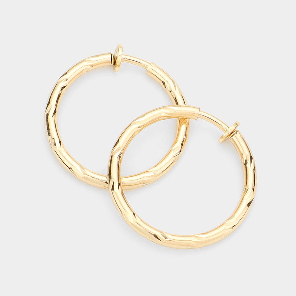 Hypoallergenic Textured Metal Clip On Hoop Earrings