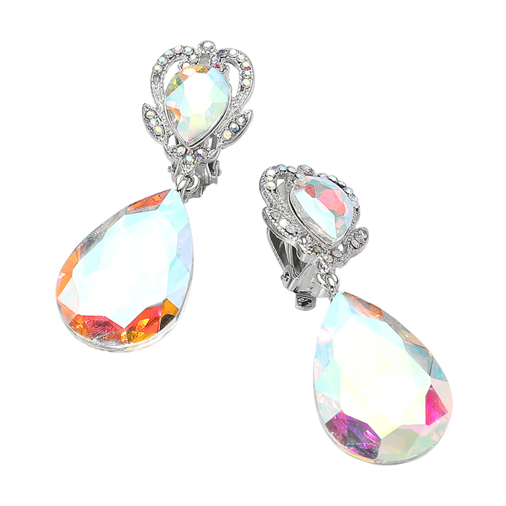 Ornate Top Faceted Teardrop Stone Dangle Clip On Evening Earrings