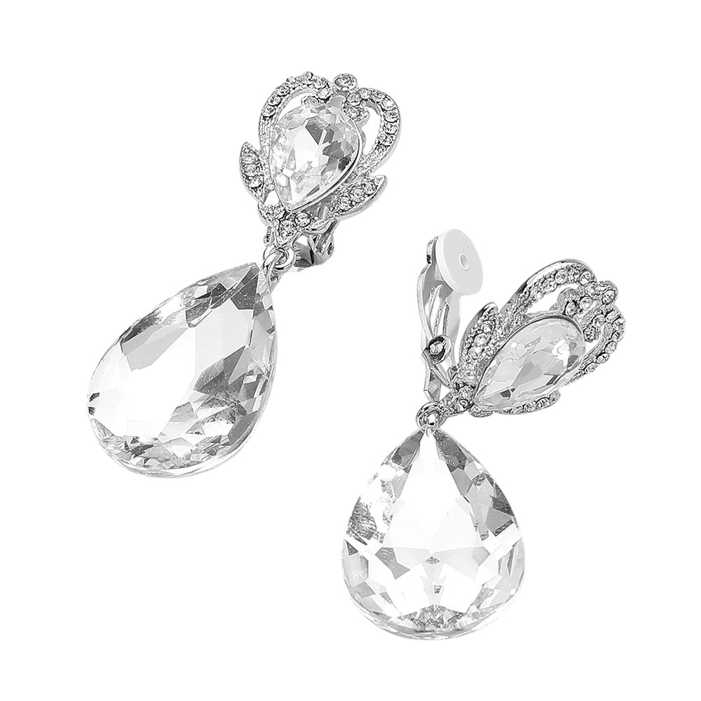 Ornate Top Faceted Teardrop Stone Dangle Clip On Evening Earrings