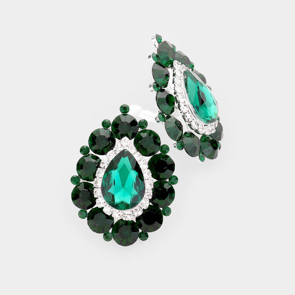 Pave Trim Crystal Teardrop Evening Clip On Earrings