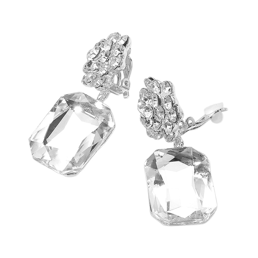 Details • Size : 0.75" X 2" • Clip On • Bold and elegant, these clip-on statement earrings feature a large faceted gemstone drop paired with a dazzling floral cluster top. Designed for a secure, non-pierced fit, perfect for adding glamour to any look. • Lead and Nickel Compliant