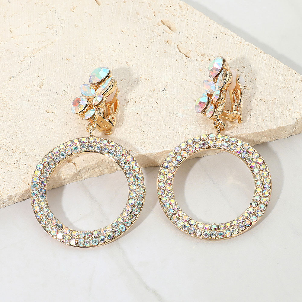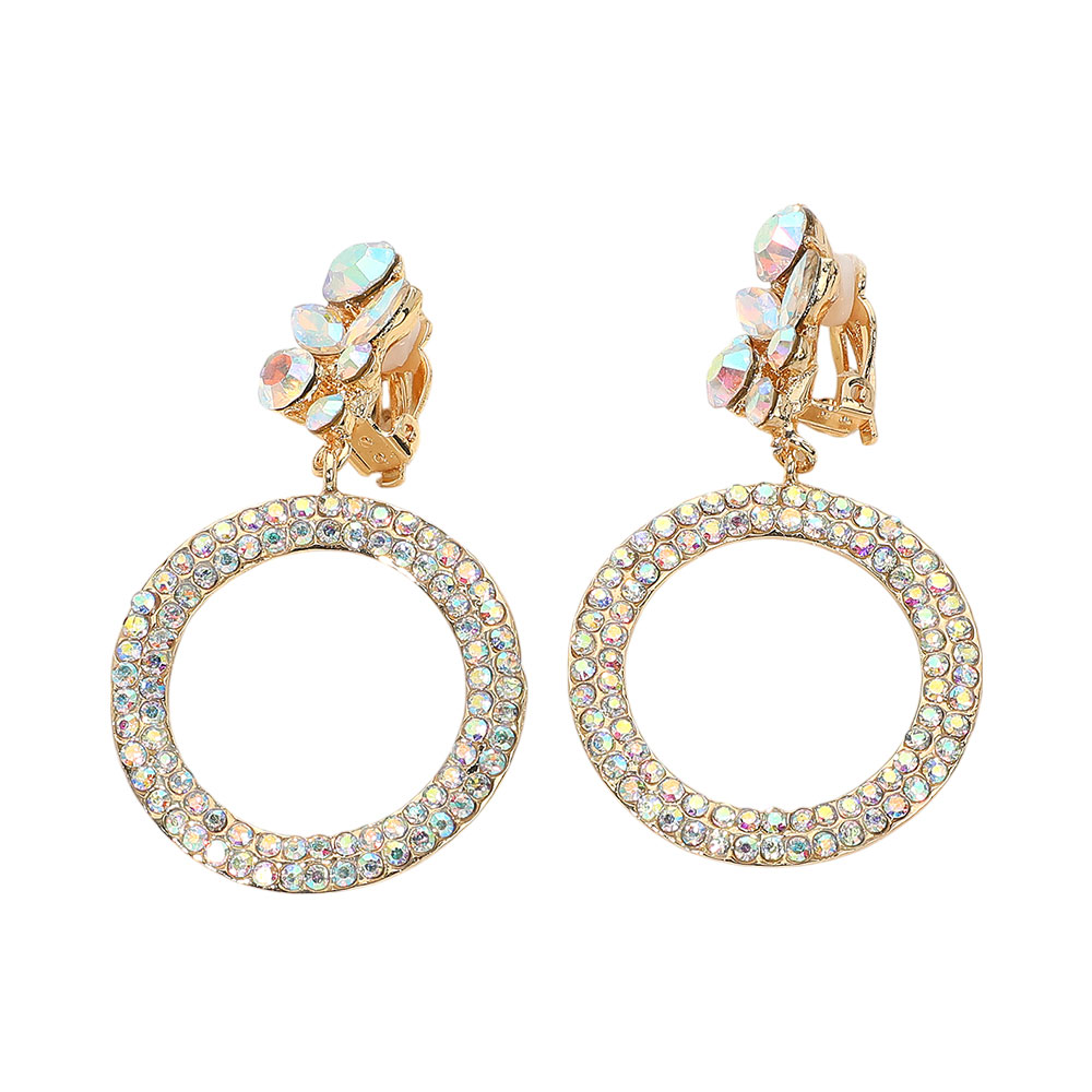 • Stylish clip-on earrings featuring large open circle drops encrusted with shimmering crystals and accented tops. Perfect for formal events, parties, or evening looks. These radiant earrings offer a bold, glamorous touch without requiring pierced ears.