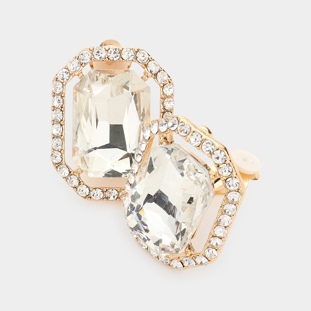 Rhinestone Trim Octagon Stone Center Evening Clip on Earrings