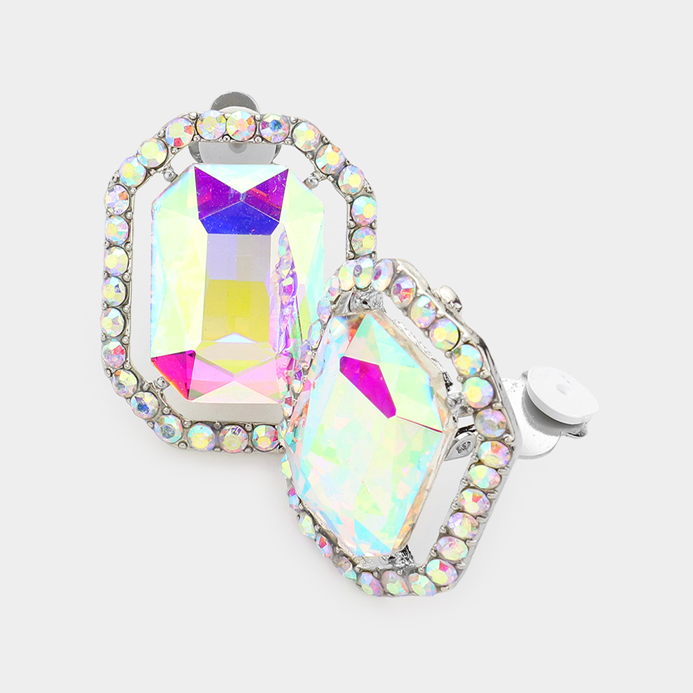 Rhinestone Trim Octagon Stone Center Evening Clip on Earrings