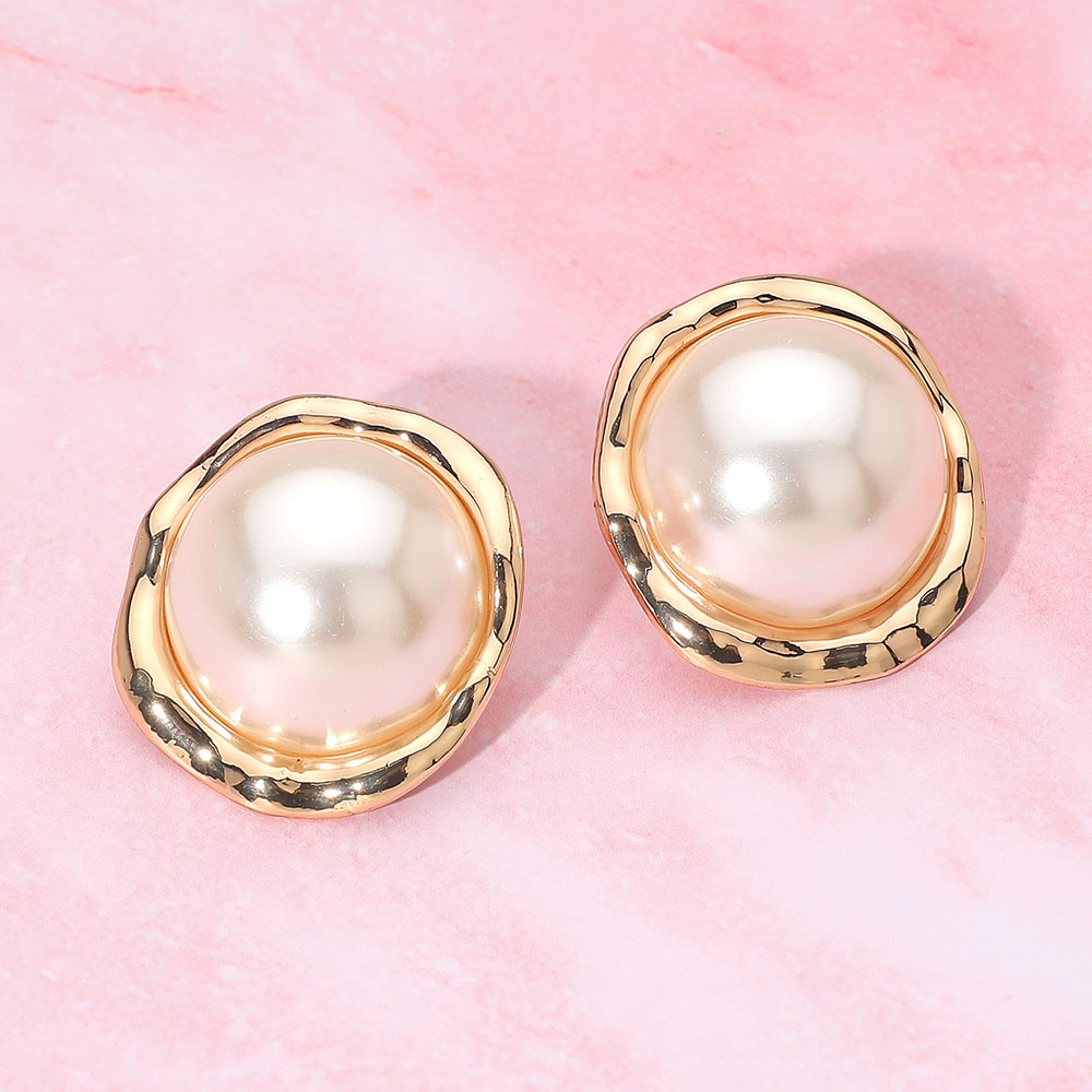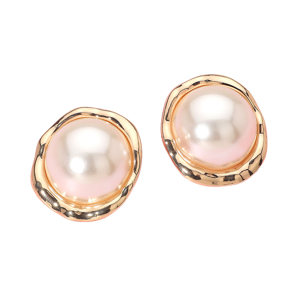 Details • Size : 1.25" X 1.25" • Clip On • Elegant round pearl dome clip-on earrings featuring a smooth polished center framed by an organic textured border. Designed for comfort without pierced ears, these timeless statement studs add a refined touch to both casual and dressy looks. • Lead and Nickel Compliant