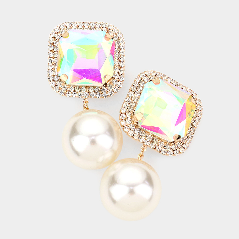 Square Stone Pearl Link Dangle Evening Clip on Earrings