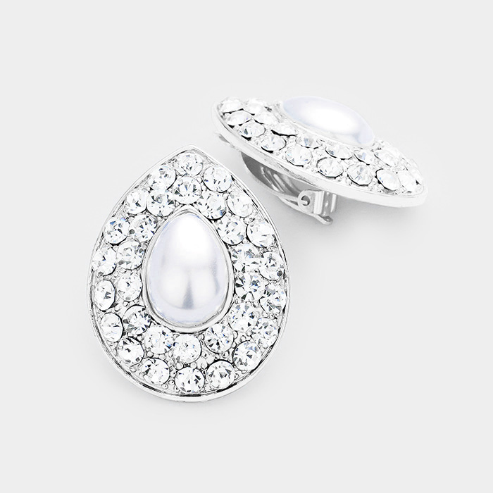Stone Pave Teardrop Pearl Centered Clip on Earrings