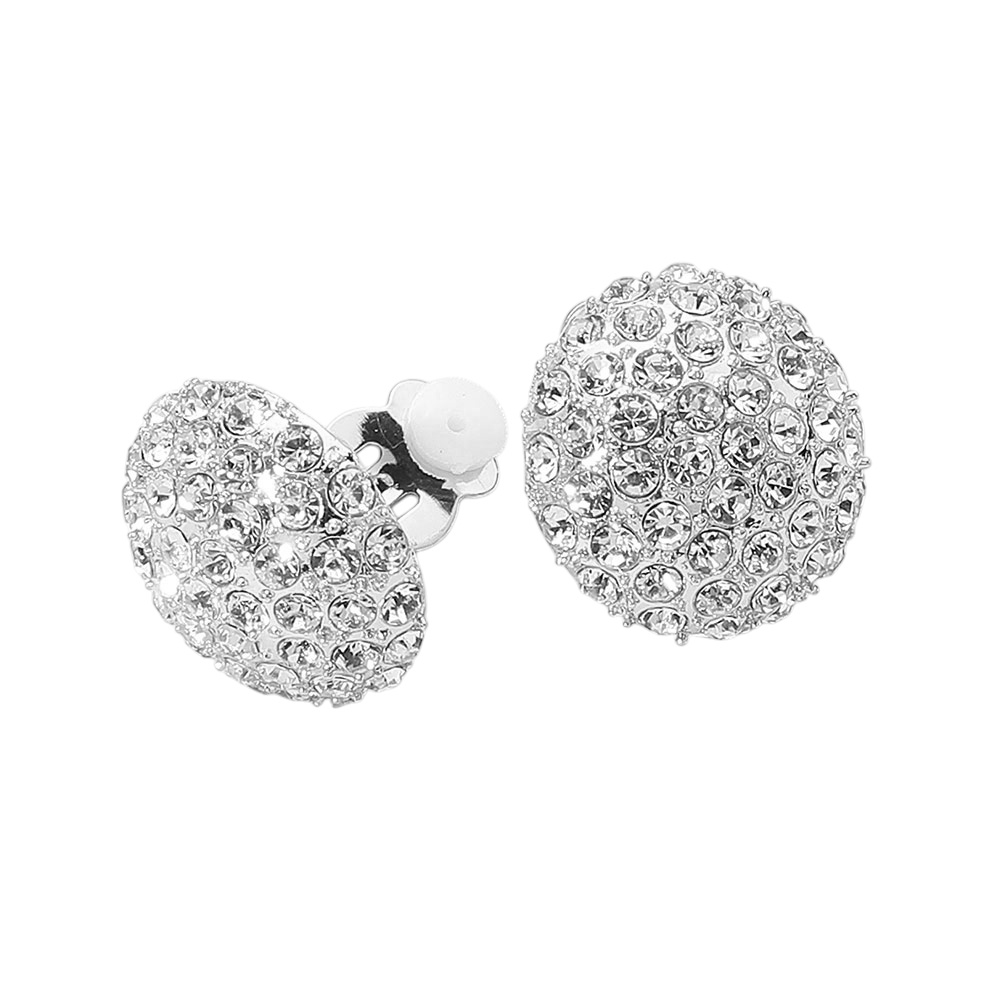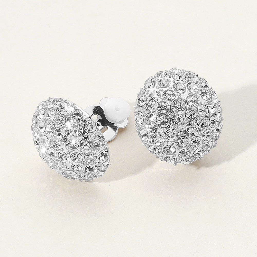 Details • Size : 0.9" X 0.9" • Clip On • These crystal pave clip-on earrings feature a rounded dome design encrusted with sparkling stones. Comfortable and stylish, they add timeless elegance to both casual and formal outfits, making them perfect for accessorizing without pierced ears. • Lead and Nickel Compliant