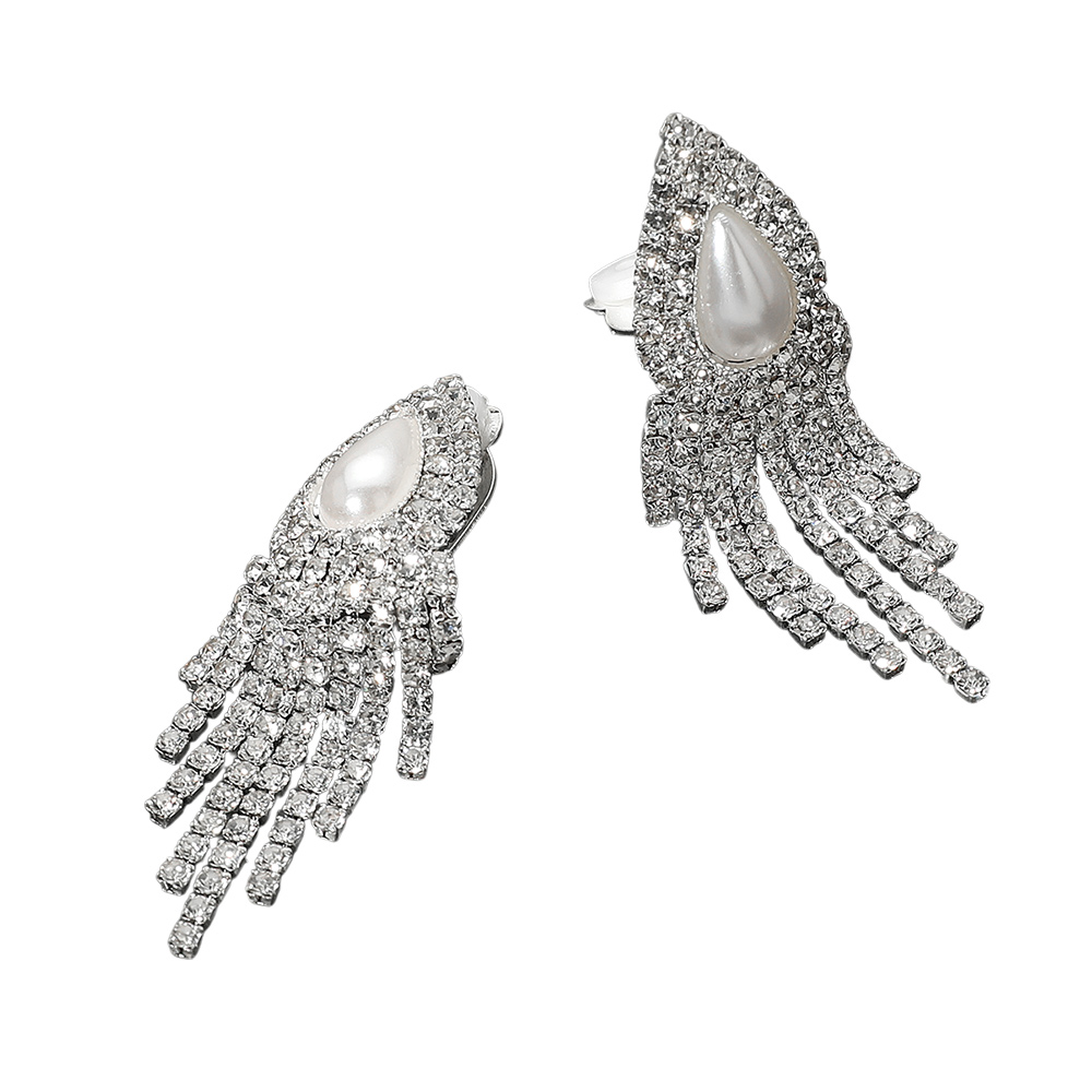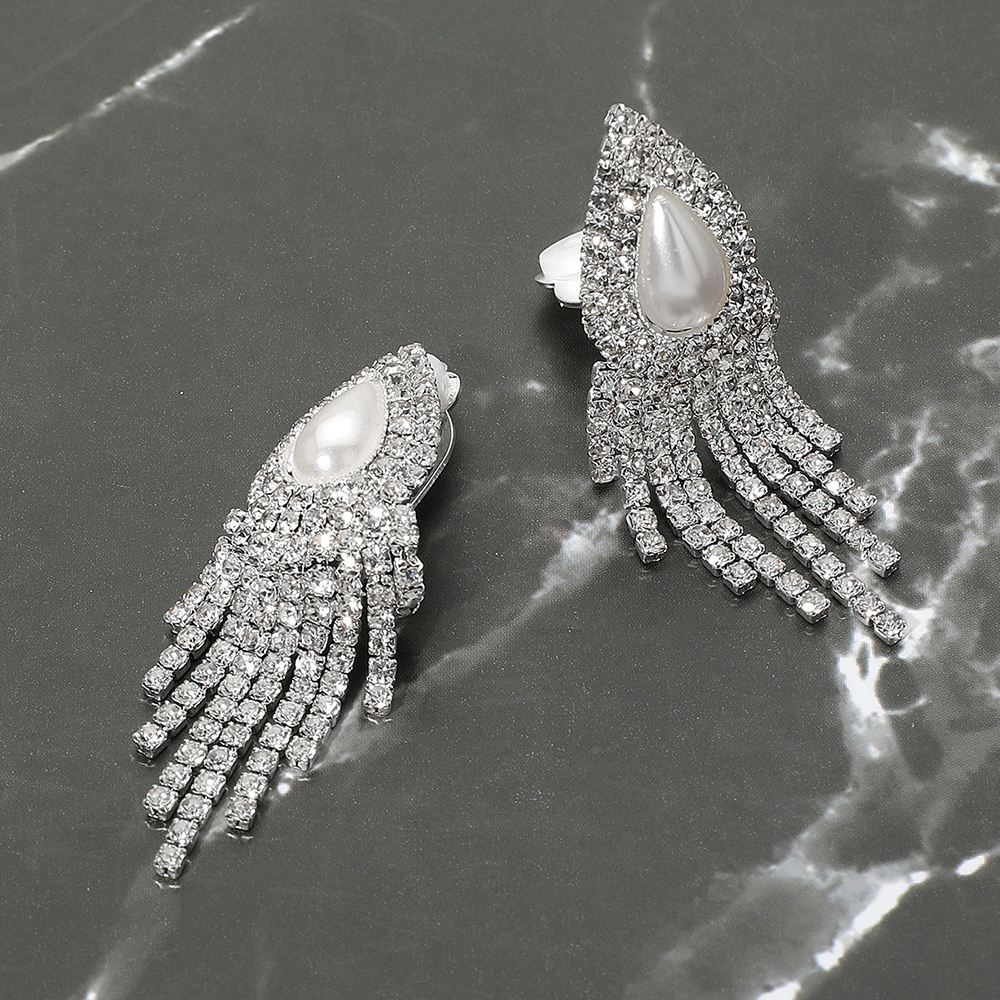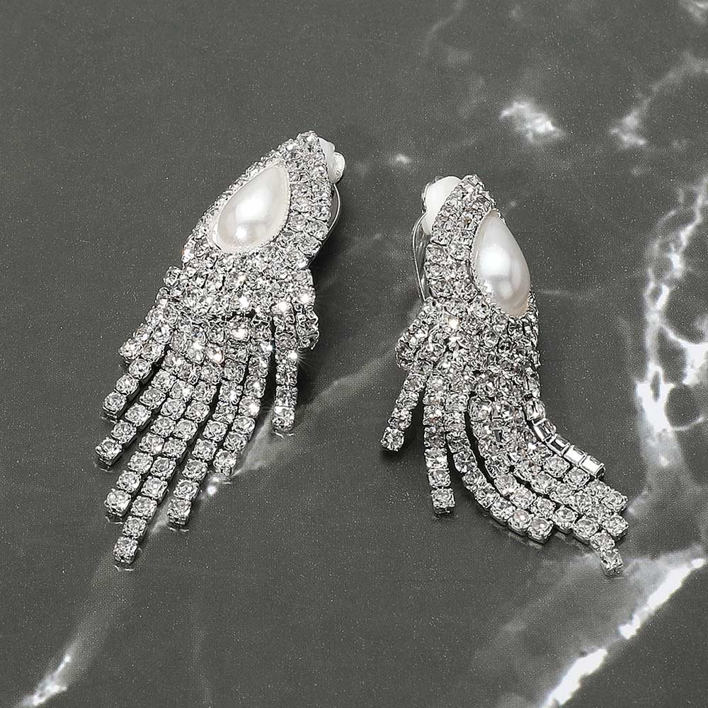 Teardrop Pearl Accented Rhinestone Fringe Dangle Evening Earrings