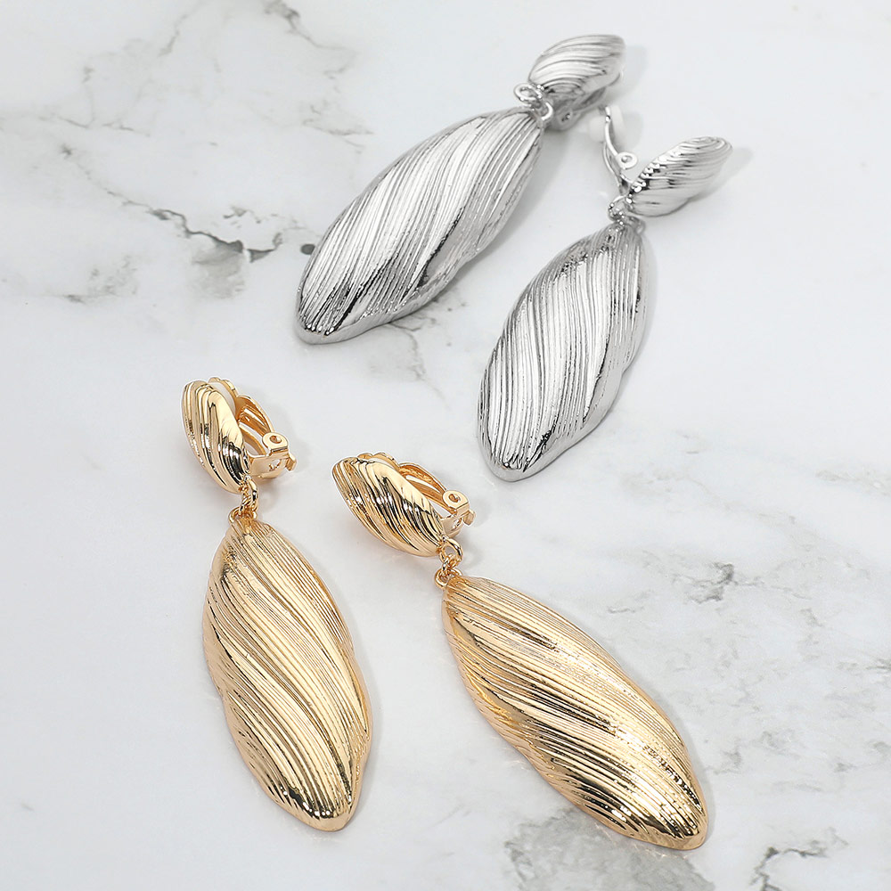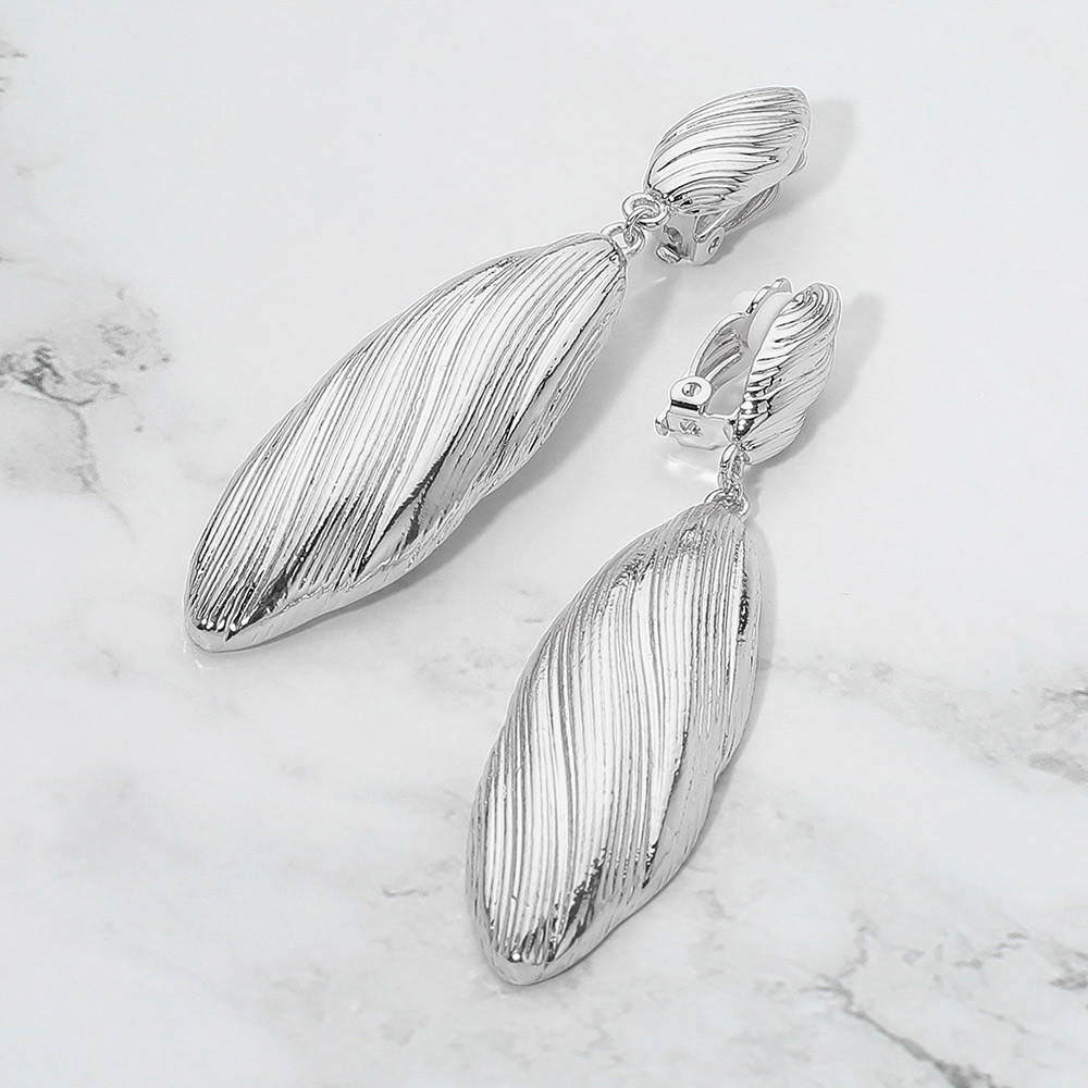 Details • Size : 0.75" X 3.1" • Clip On • Elevate your look with these textured drop clip-on earrings, crafted in a flowing elongated design. Their lightweight structure and secure clip-on style make them perfect for statement wear without compromising comfort. • Lead and Nickel Compliant