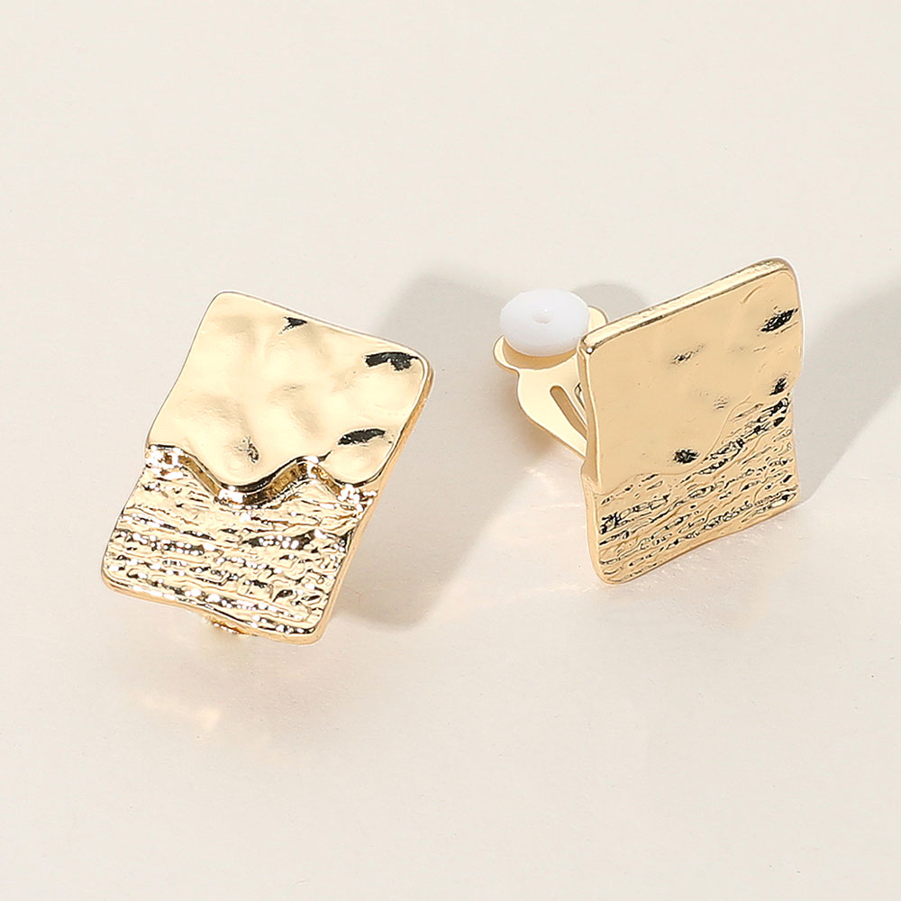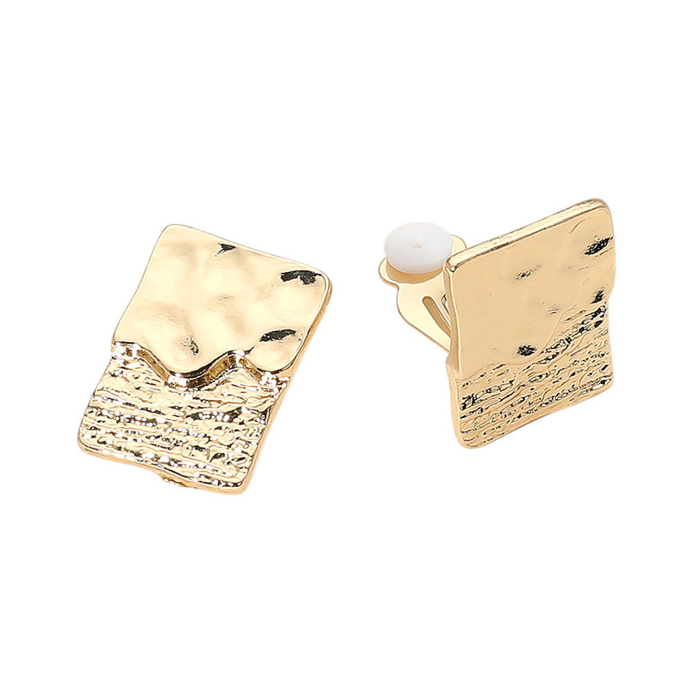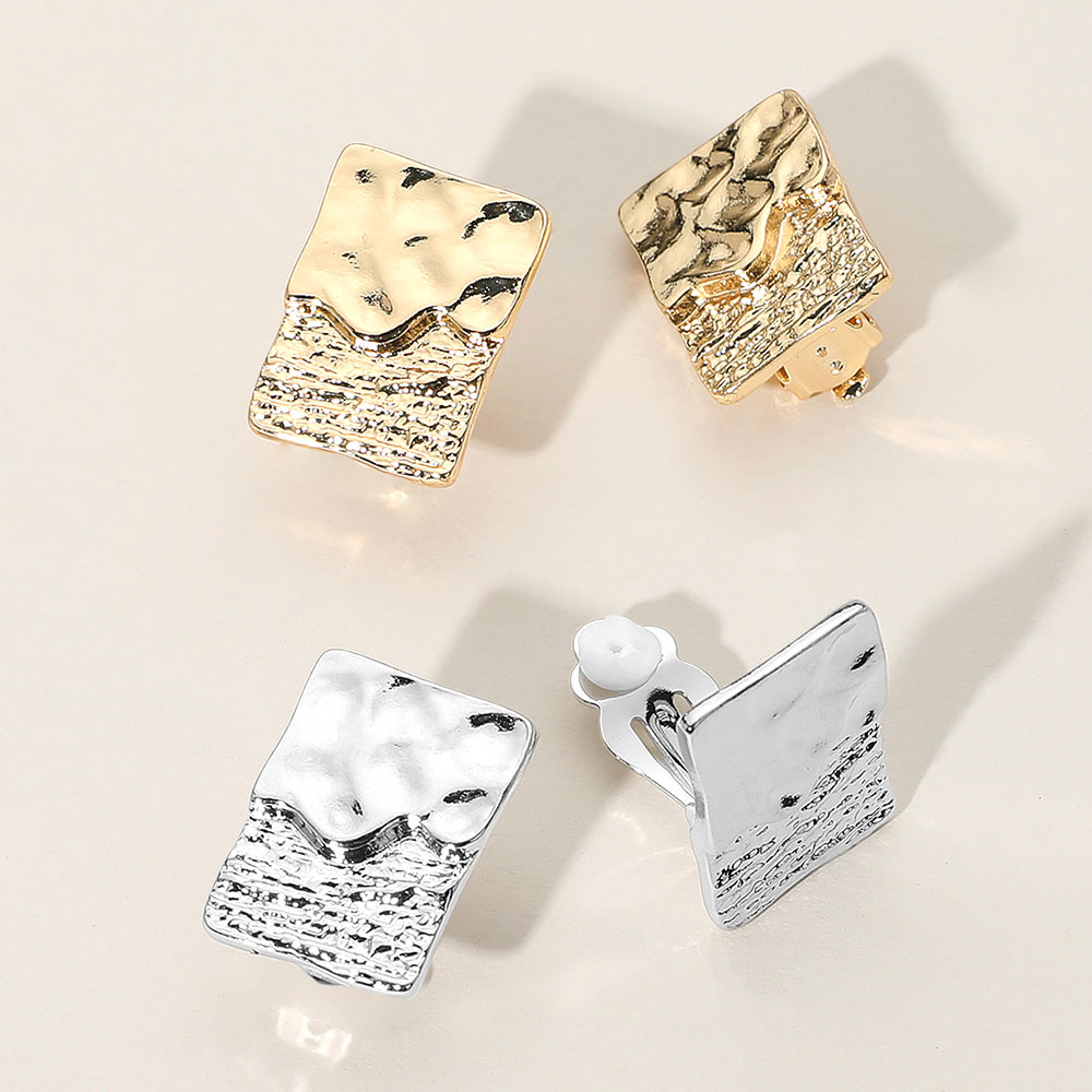 Details • Size : 0.7" X 0.8" • Clip On • These rectangular clip-on earrings feature a refined blend of smooth and textured surfaces, offering a bold yet elegant style. Designed for comfort without piercing, they are ideal for making a subtle statement with a contemporary edge. • Lead and Nickel Compliant