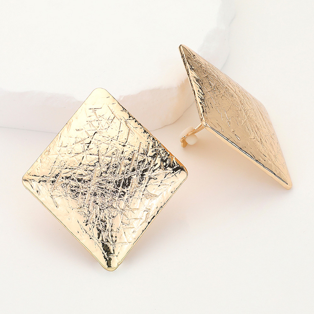 Details • Size : 2" X 2.25" • Clip On • Make a bold style statement with these geometric diamond clip-on earrings. Featuring a textured surface and modern silhouette, they bring elegance and edge to any look. Perfect for both everyday wear and special occasions. • Lead and Nickel Compliant