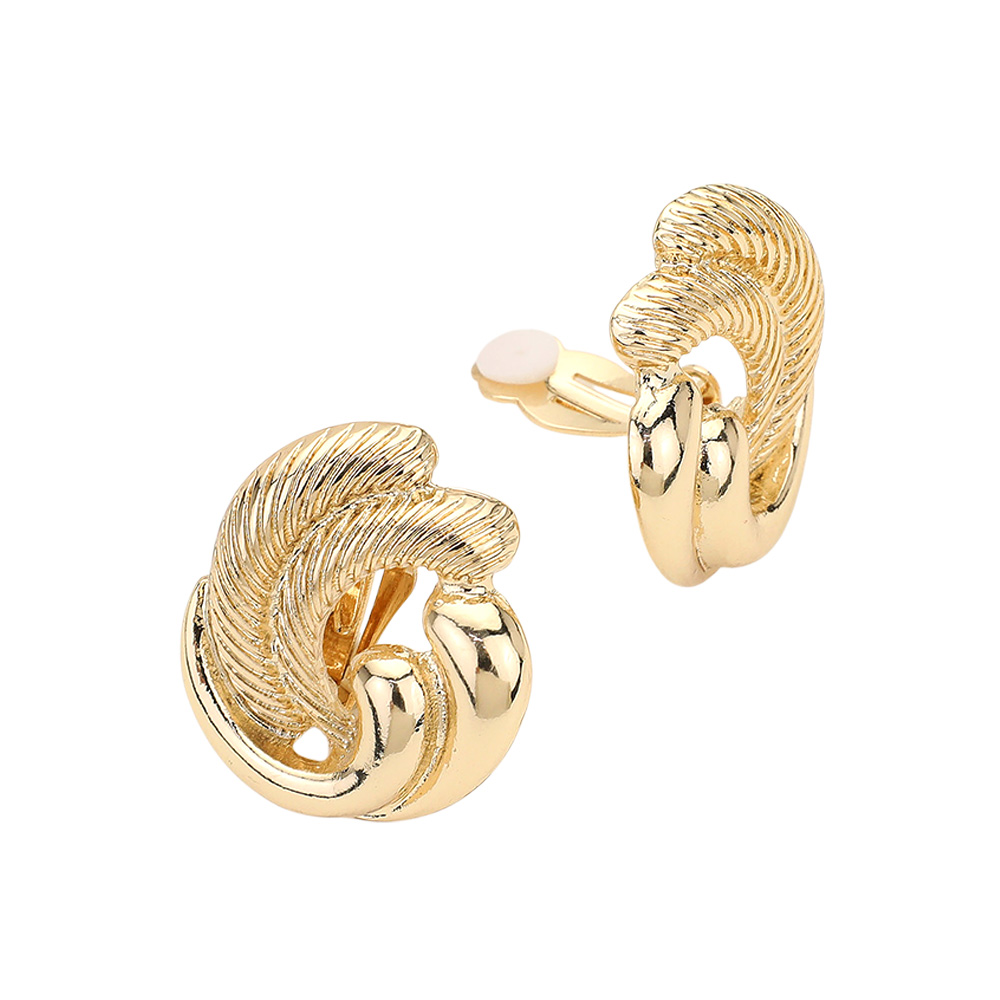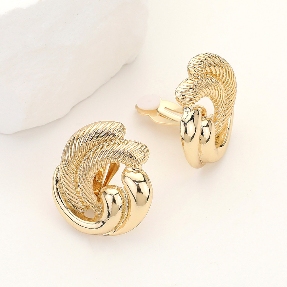Details • Size : 1" X 1.25" • Clip On • These wave-inspired clip-on earrings bring sculptural elegance with their flowing curves and textured detailing. Designed for comfort and style, they make a refined statement accessory without requiring pierced ears. • Lead and Nickel Compliant