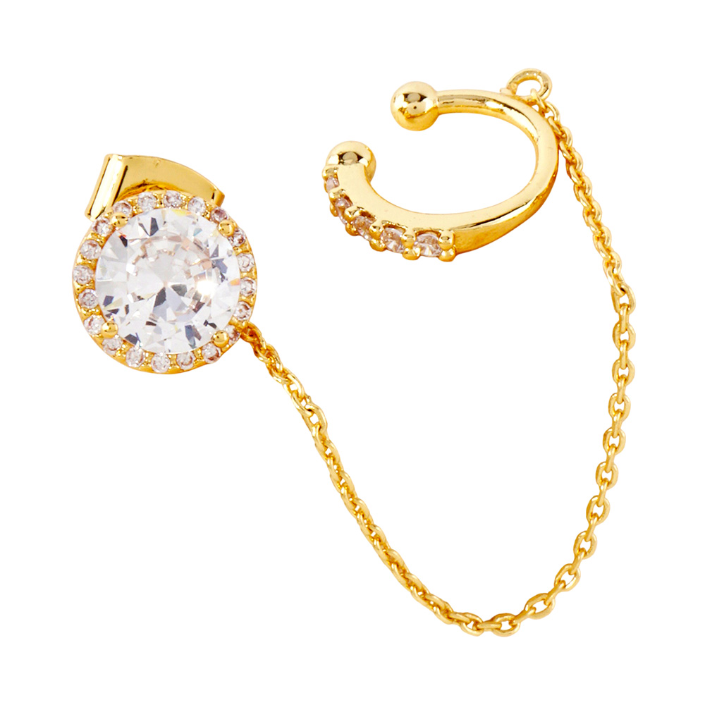 Details • Size : 0.8" X 2.2" • This refined gold-dipped chain earring pairs a dazzling round cubic zirconia stud with a sleek ear cuff, joined by a delicate chain. Designed with hypoallergenic sterling silver posts, it offers a modern yet elegant statement perfect for both casual and evening wear. • CZ Cubic Zirconia • Gold Dipped • Hypoallergenic • Lead and Nickel Compliant • Made In Korea • Sterling Silver Post