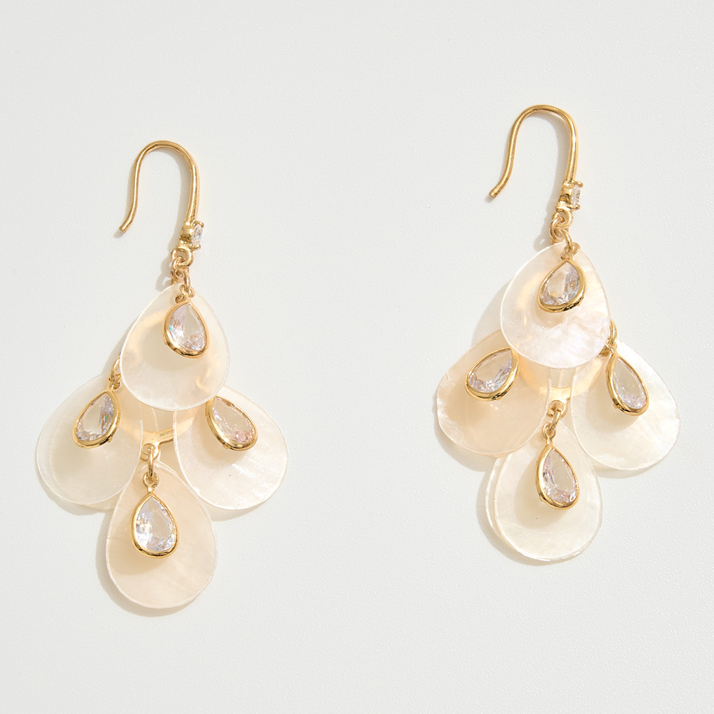 Details • Size : 1.2" X 2.5" • Fish Hook Back • These teardrop shell chandelier earrings dazzle with layered drops adorned by sparkling crystal accents. Light-catching and elegant, they bring a touch of beachy sophistication to evening looks, resort wear, or any outfit needing a statement piece with natural charm. • Brass • CZ Cubic Zirconia • Gold Dipped • Hypoallergenic • Lead and Nickel Compliant • Made In Korea