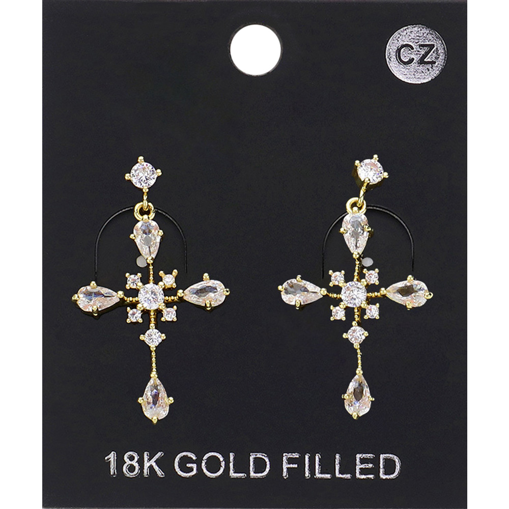 18K Gold Filled CZ Stone Cross Pendant Dangle Earrings