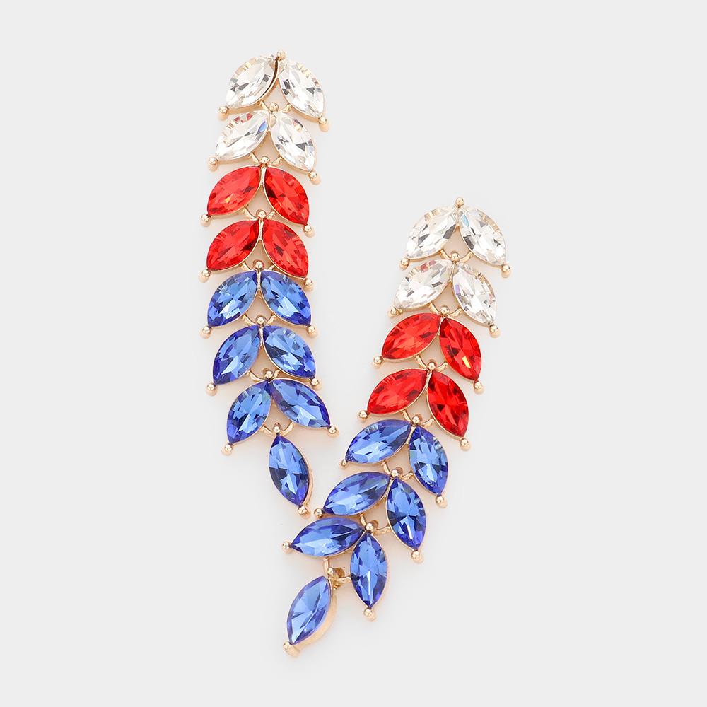 Details • Size : 0.6" X 2.75" • Post Back • Add a touch of elegance with these leaf-inspired drop earrings featuring American USA flag colored marquise-cut crystals. A refined accessory for formal occasions or sophisticated everyday style. • Lead and Nickel Compliant