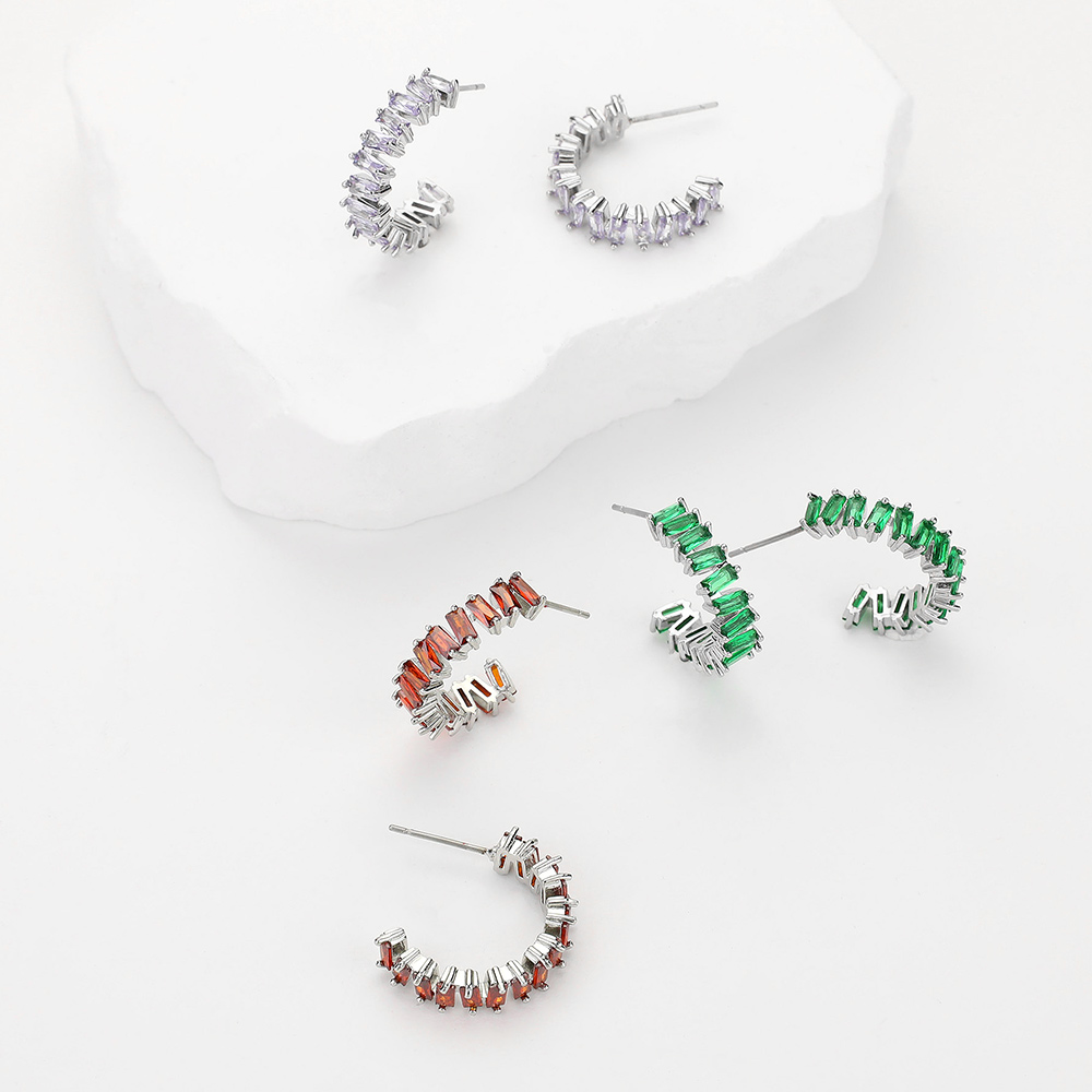 • Add a refined sparkle to your look with these half hoop earrings featuring shimmering baguette stones in a modern arc design. Perfect for formal occasions or stylish daily wear, they offer a unique twist on the classic hoop.