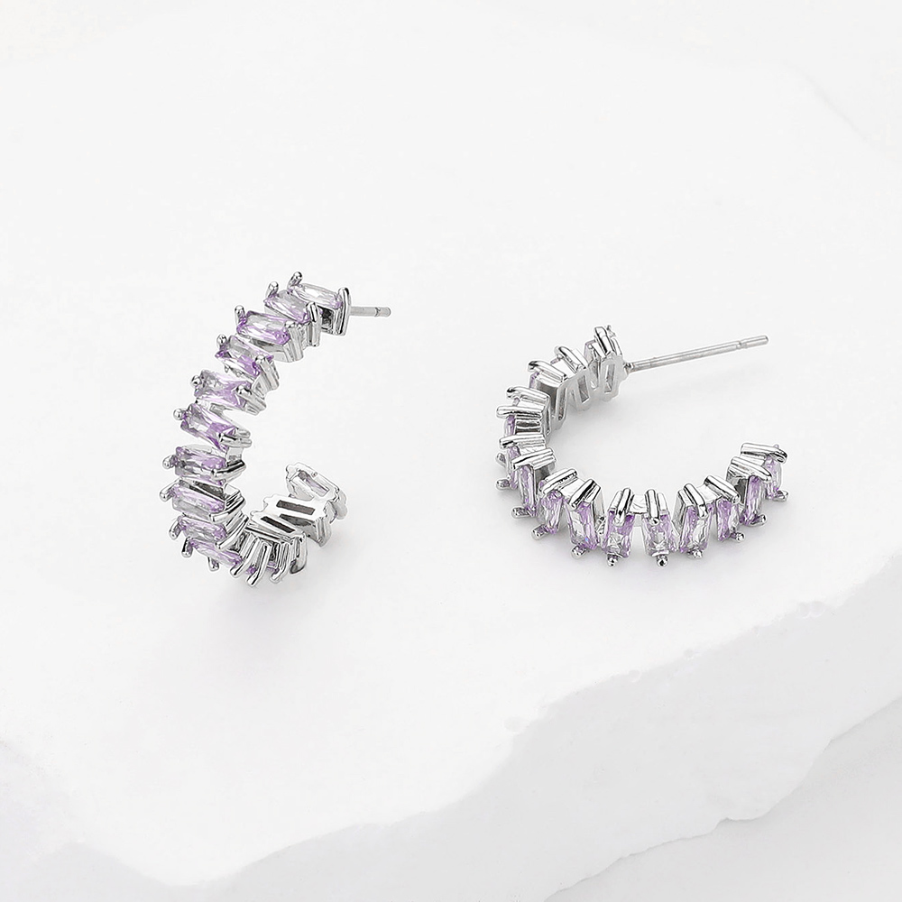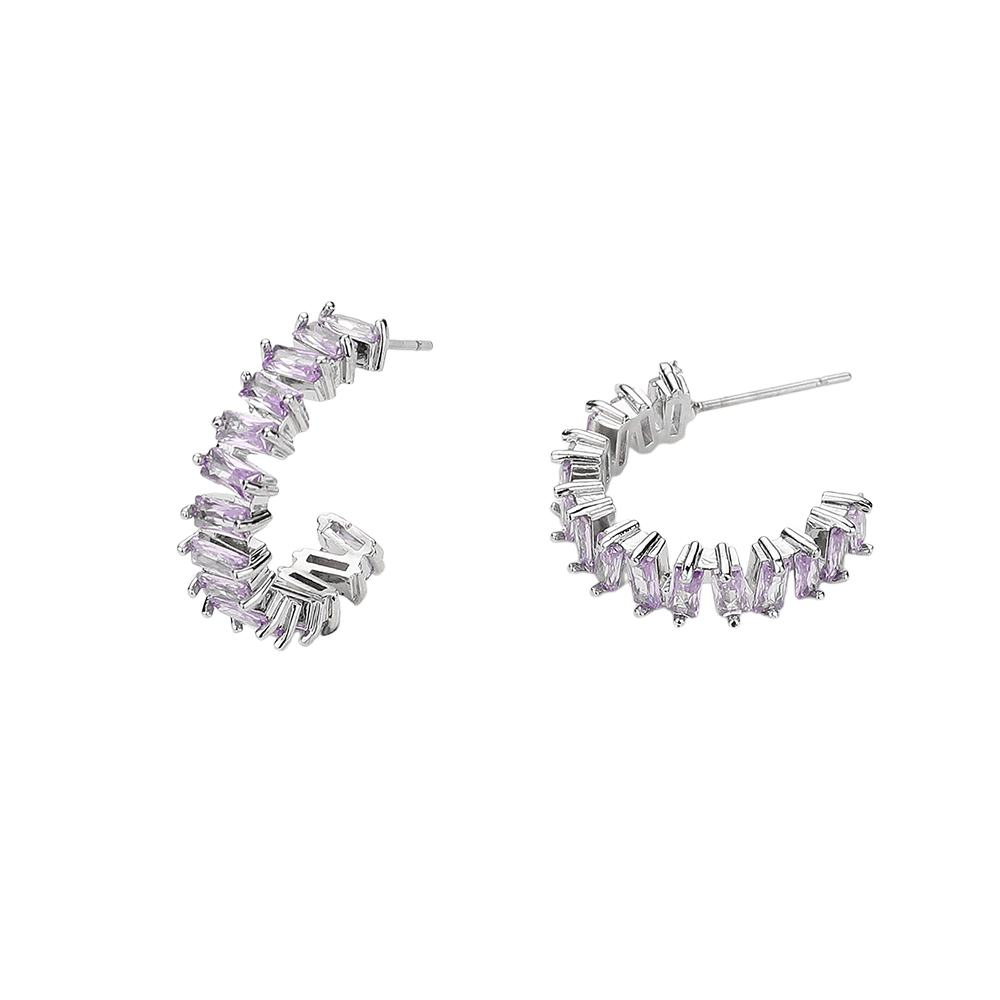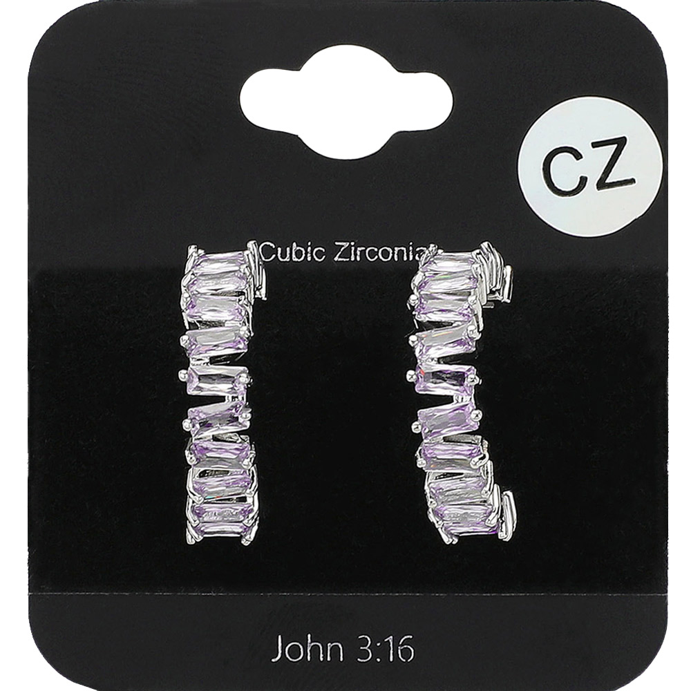 Details • Size : 0.75" L • Post Back • Add a refined sparkle to your look with these half hoop earrings featuring shimmering baguette stones in a modern arc design. Perfect for formal occasions or stylish daily wear, they offer a unique twist on the classic hoop. • CZ Cubic Zirconia