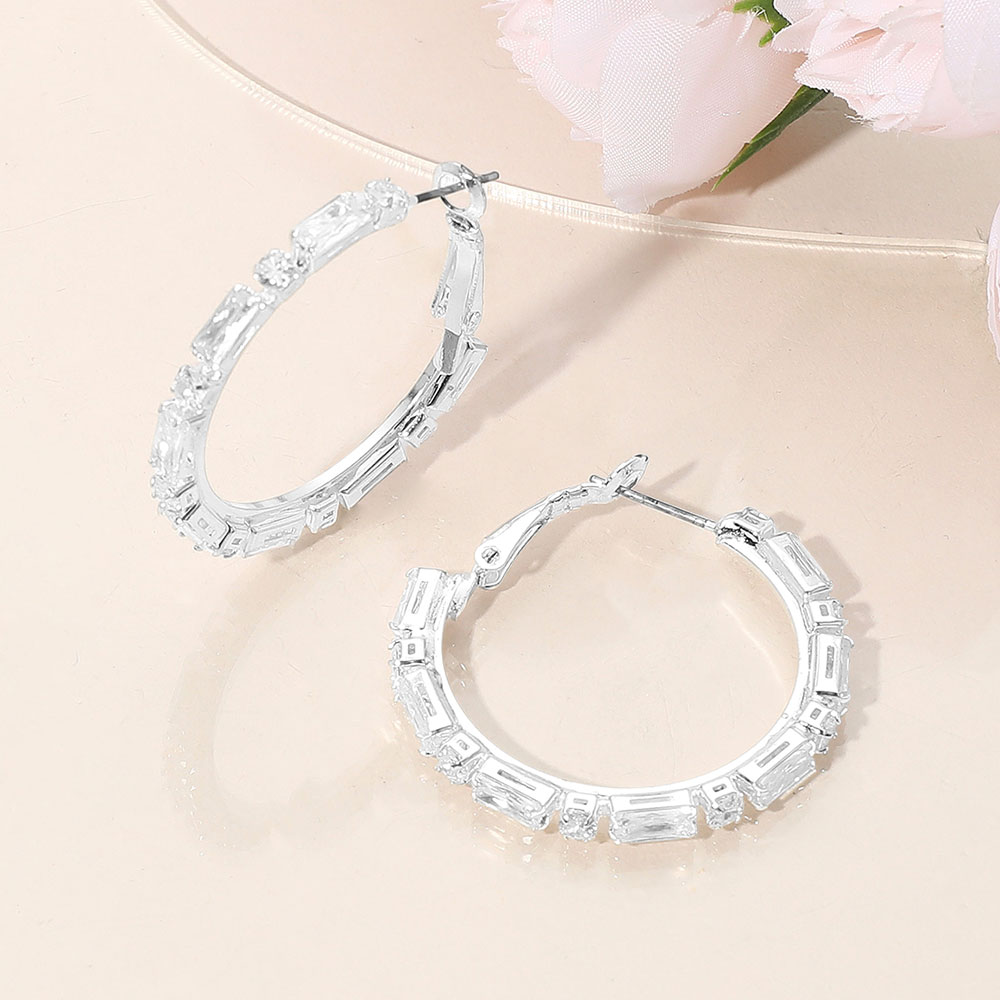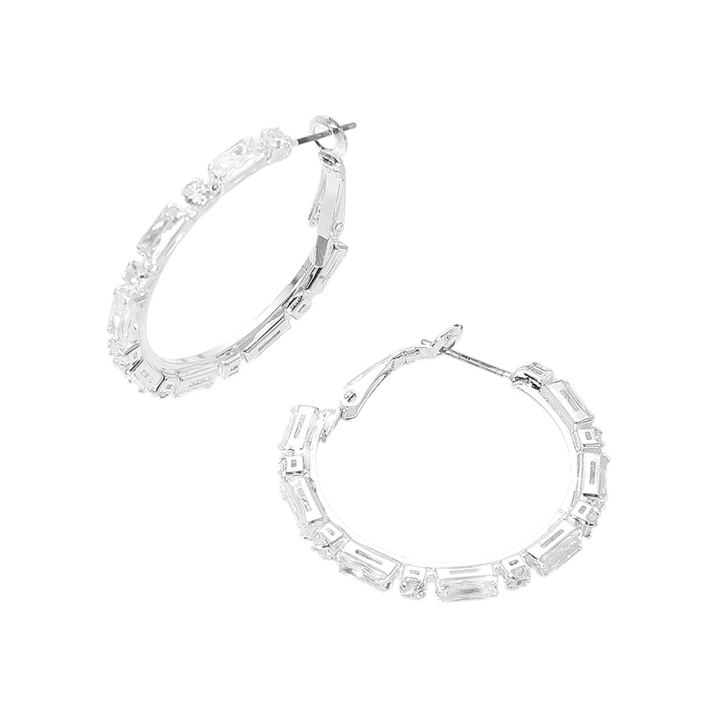 Details • Size : 1.5" X 1.5" • Omega Back • Stylish hoop earrings adorned with alternating baguette and round stone accents for a refined and modern touch. A versatile accessory that enhances everyday looks or adds shine to special occasions. • CZ Cubic Zirconia • Lead and Nickel Compliant