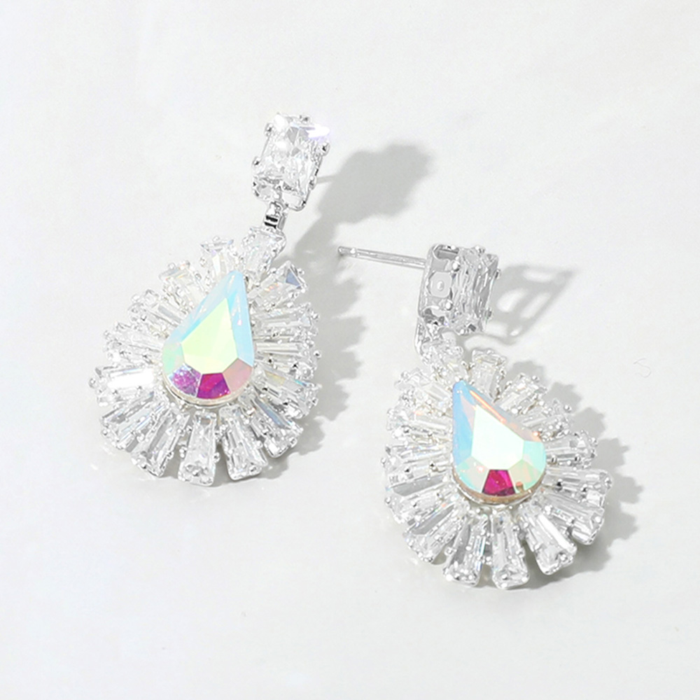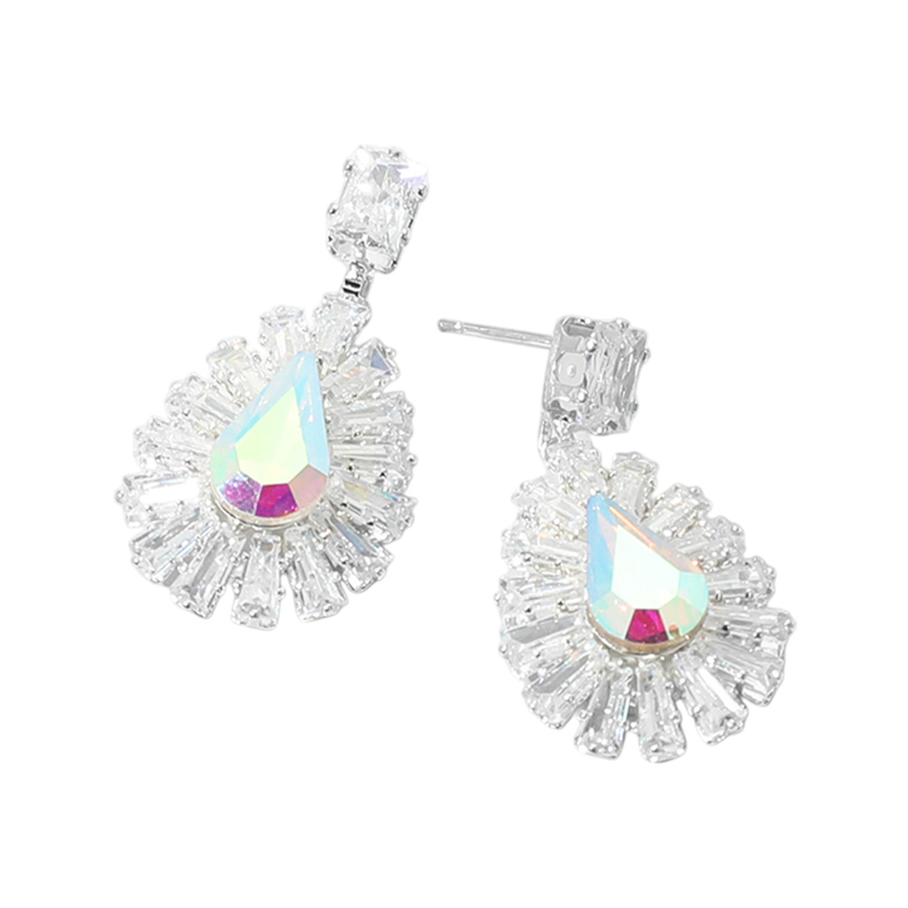 Baguette Stone Rim Teardrop CZ Stone Cluster Dangle Evening Earrings
