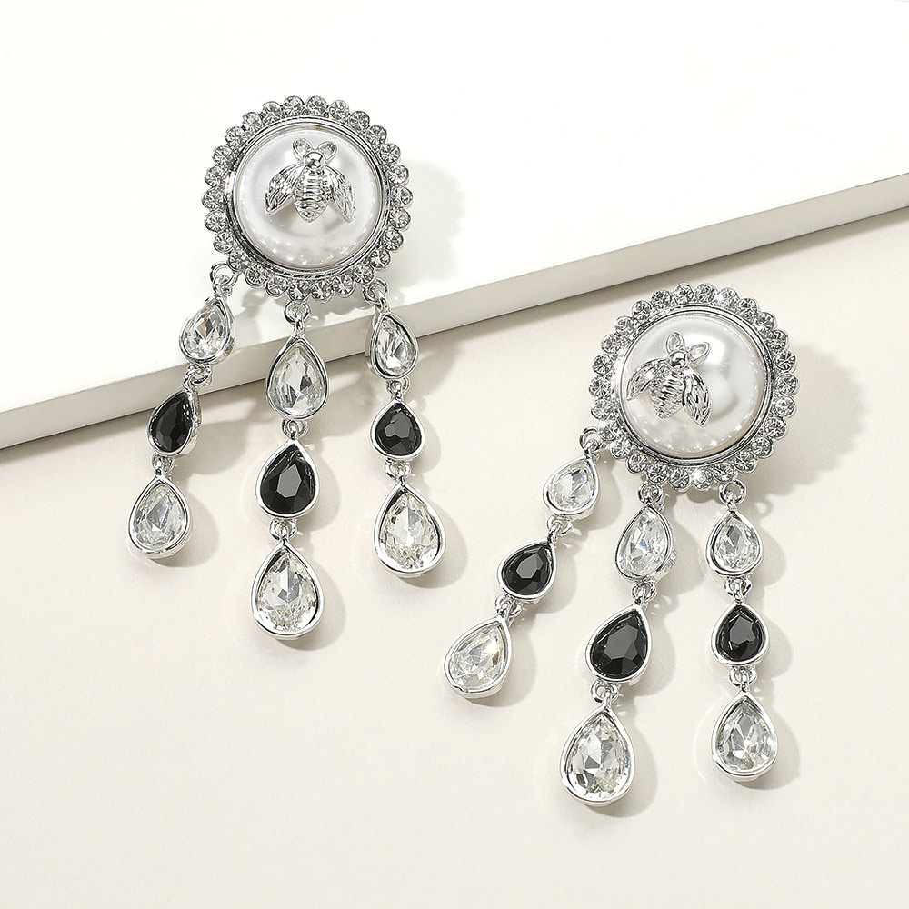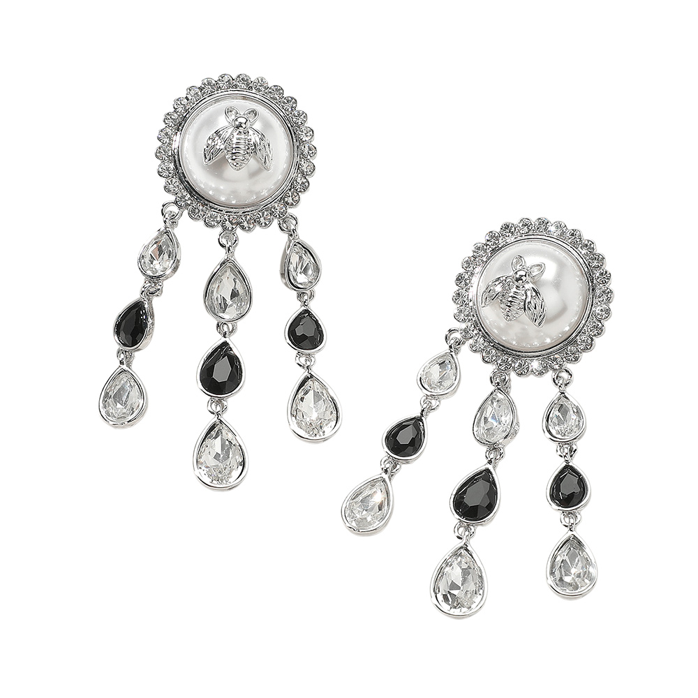 Bumble Bee Pearl Accented Teardrop Stone Cluster Drop Down Earrings