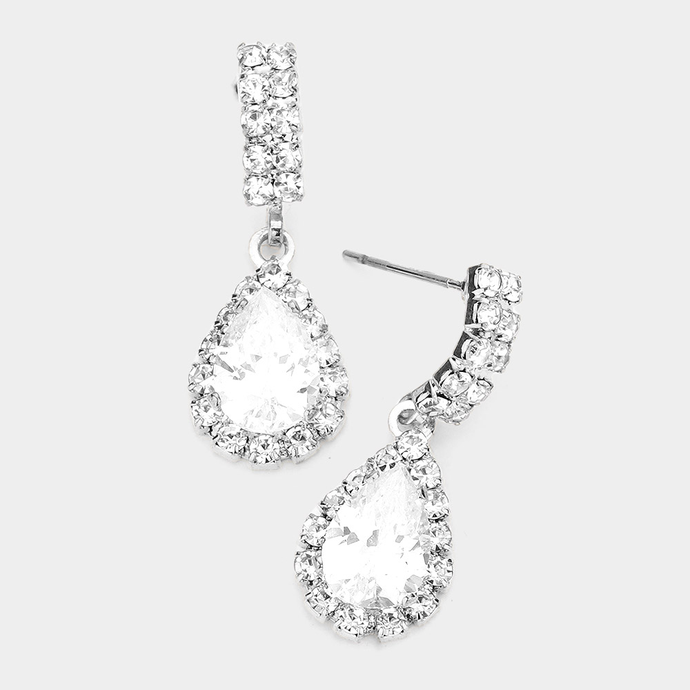 CZ Embellished Curved Bar Teardrop Link Dangle Evening Earrings