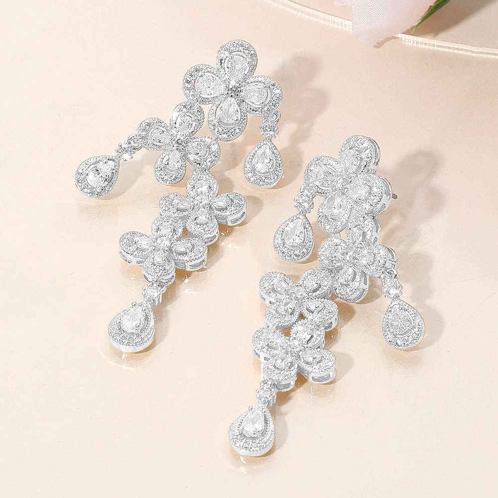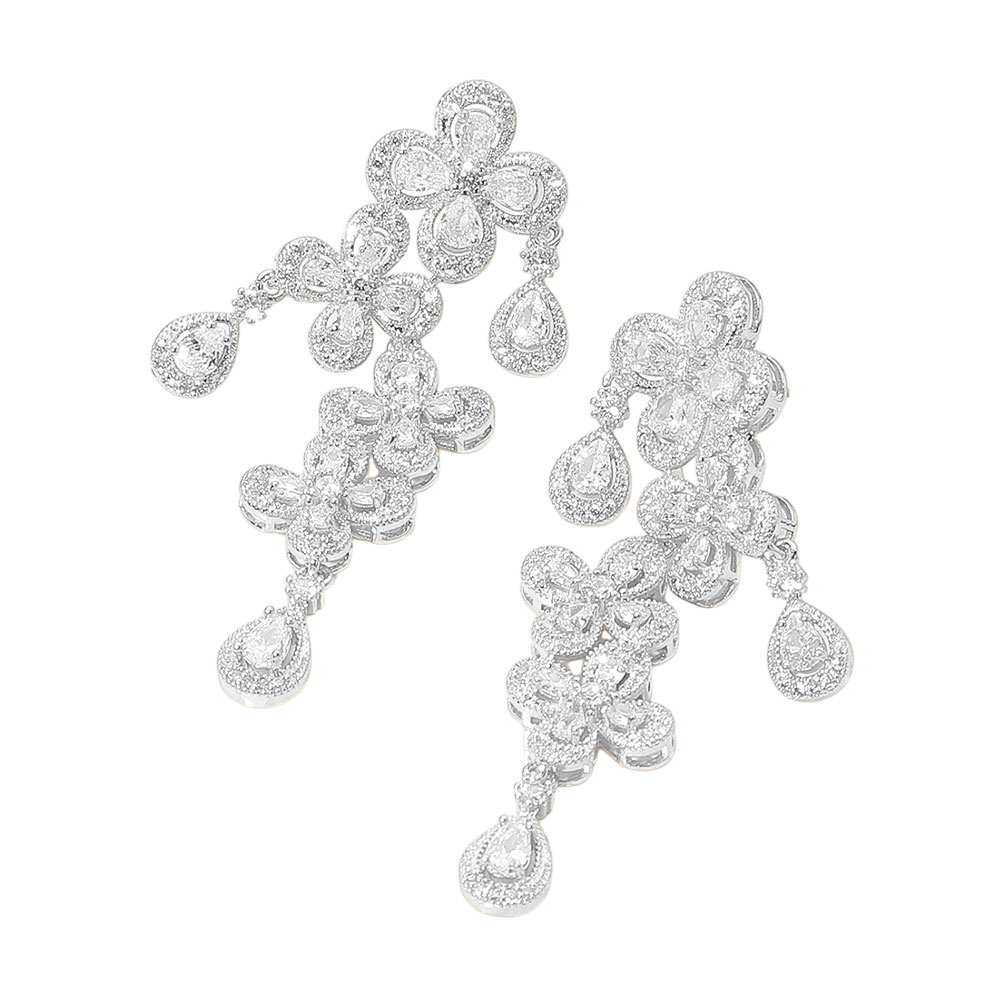 Details • Size : 1" X 2.1" • Post Back • Turn heads with these elegant floral drop earrings, adorned with shimmering teardrop accents and intricate detailing. Perfect for weddings, formal events, or adding a luxurious touch to evening attire. A must-have for any statement jewelry collection. • CZ Cubic Zirconia