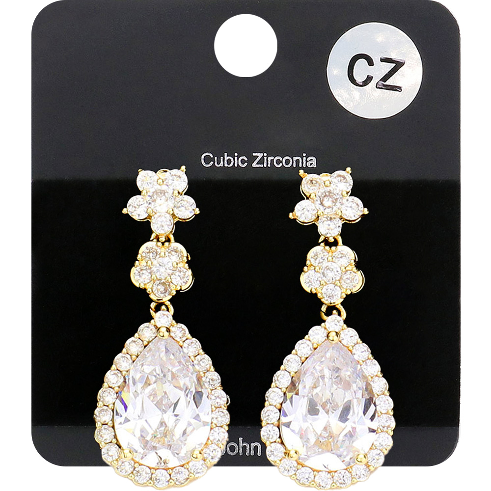 Details • Size : 0.5" X 1.3" • Post Back • Elegant dangle earrings featuring large teardrop-shaped cubic zirconia stones framed in a shimmering gold tone. Accented with petite floral CZ clusters, these earrings are ideal for weddings, galas, or adding glamour to evening wear. • CZ Cubic Zirconia