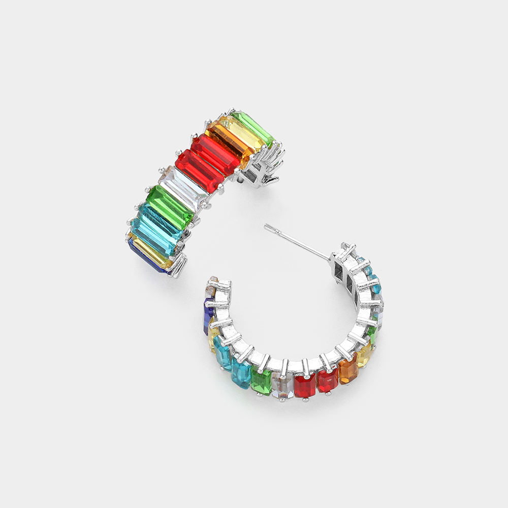 CZ Rectangle Stone Cluster Half Hoop Evening Earrings