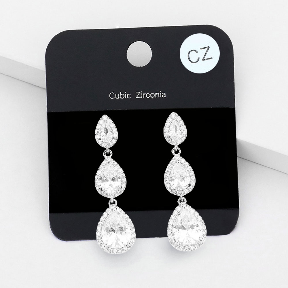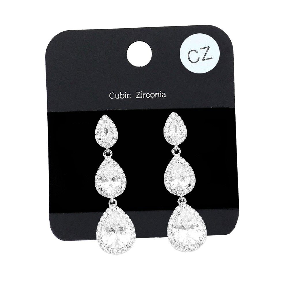 • Elegant triple teardrop dangle earrings with sparkling cubic zirconia stones. These cascading drops deliver stunning shine and graceful movement, ideal for formal events, weddings, or upscale nights out.