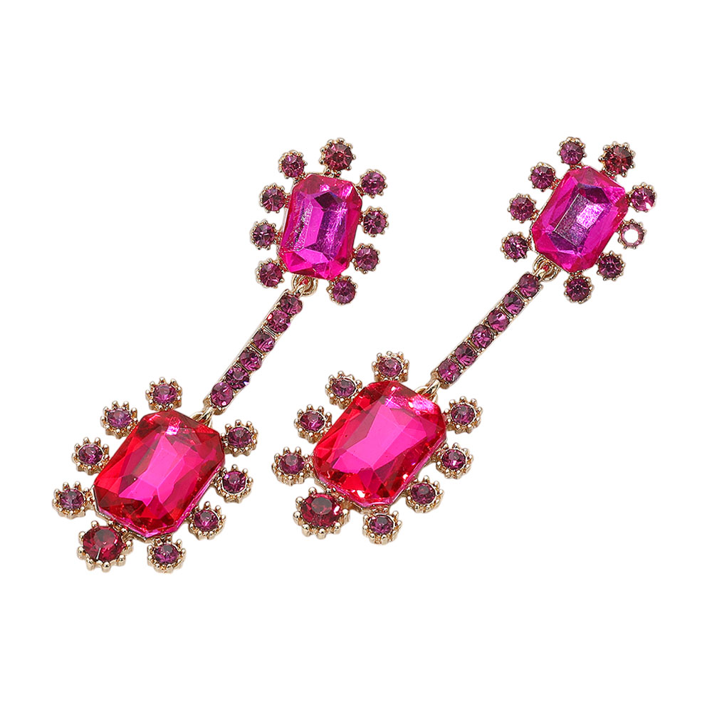 Double Emerald Cut Stone Accented Dangle Evening Earrings