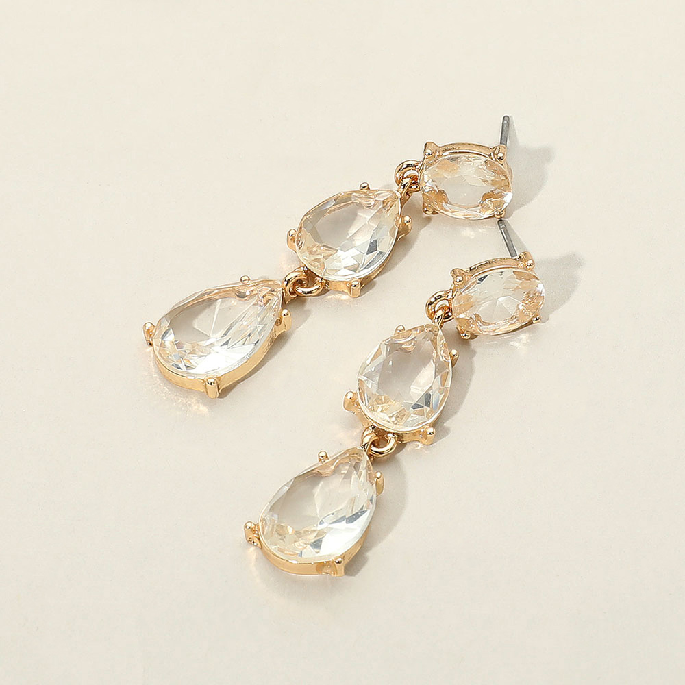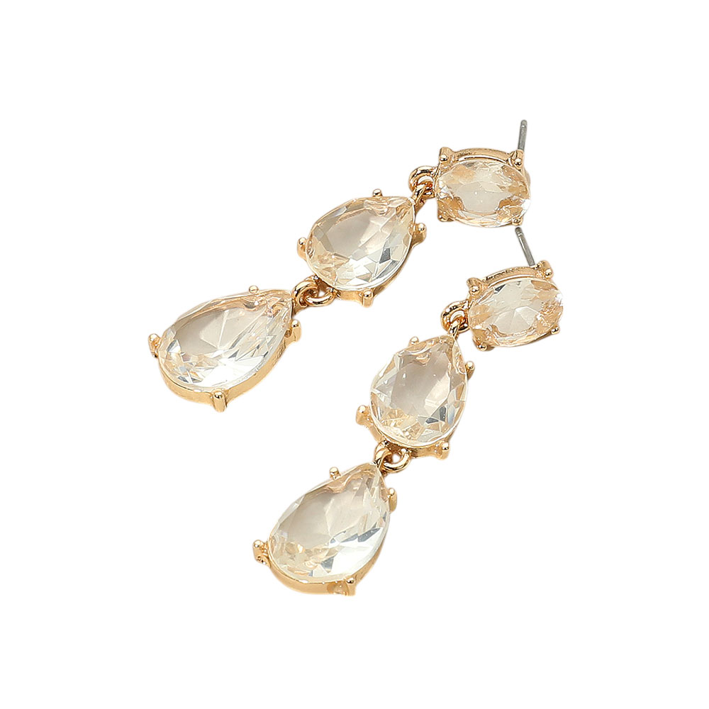 Details • Size : 0.5" X 1.75" • Post Back • Elegant drop earrings featuring triple teardrop crystal stones in a gold-tone setting. Perfect for weddings, parties, or everyday glam with timeless sophistication and sparkle. • Lead and Nickel Compliant