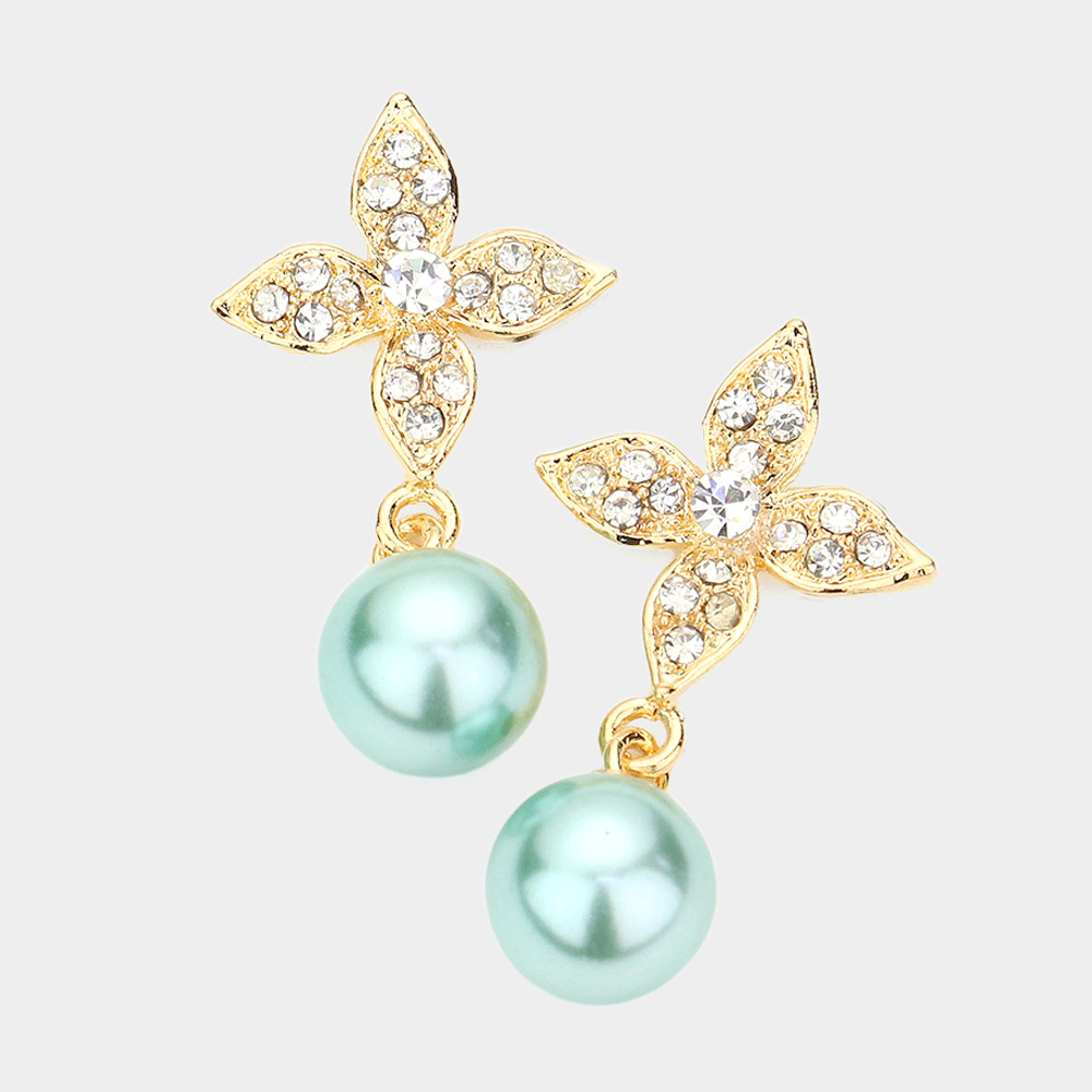 Elegant Floral Motif Crystal Pearl Drop Earrings