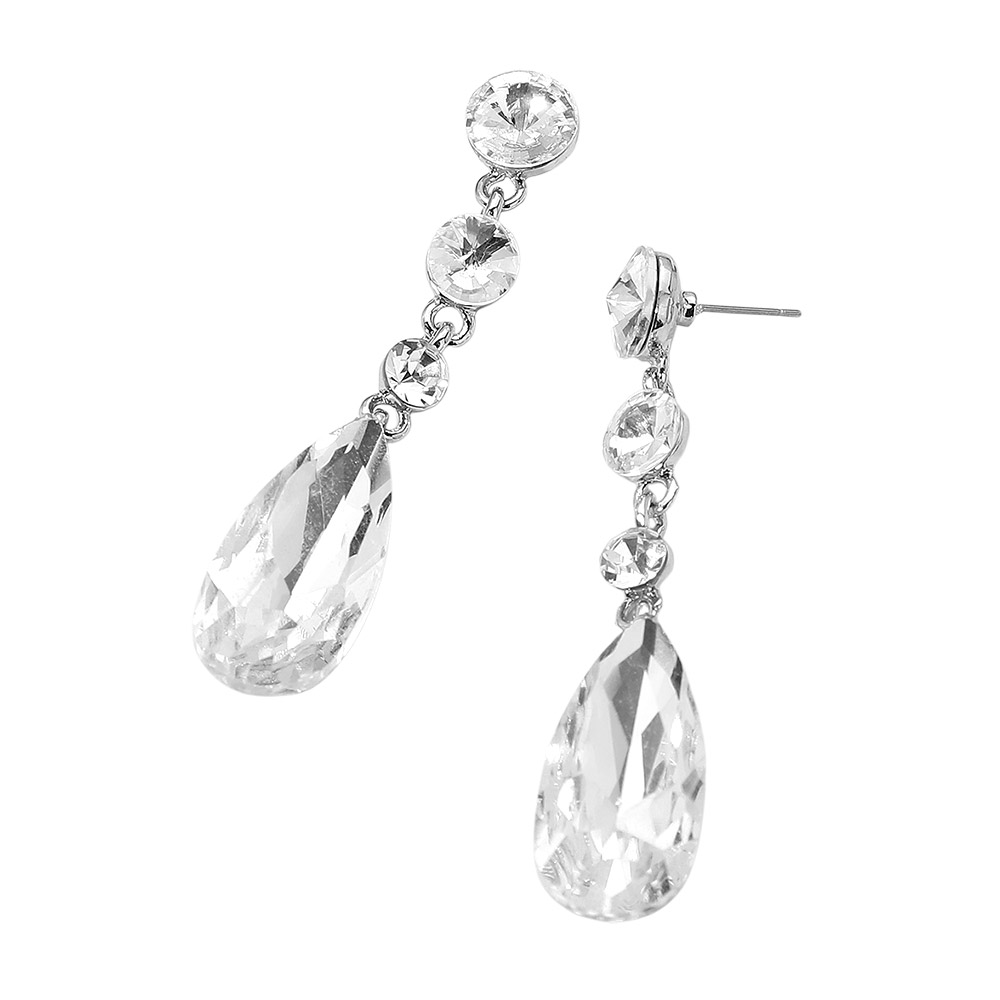 Details • Size : 0.6" X 2.7" • Post Back • Make a glamorous statement with these elegant Multi-Faceted Dangle Earrings. Each earring features a brilliant, large pear-shaped crystal suspended below a line of three smaller, round, sparkling gems. The stones possess a spectacular iridescent shimmer that shifts in the light, displaying a captivating play of different hues. Set in a slim metallic drop design, these earrings offer striking length and sparkle, making them the perfect choice for formal events, weddings, proms, or any occasion requiring a touch of sophisticated glamour. • Lead and Nickel Compliant
