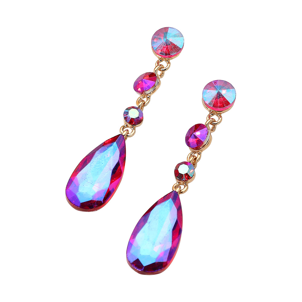 Details • Size : 0.6" X 2.7" • Post Back • Make a glamorous statement with these elegant Multi-Faceted Dangle Earrings. Each earring features a brilliant, large pear-shaped crystal suspended below a line of three smaller, round, sparkling gems. The stones possess a spectacular iridescent shimmer that shifts in the light, displaying a captivating play of different hues. Set in a slim metallic drop design, these earrings offer striking length and sparkle, making them the perfect choice for formal events, weddings, proms, or any occasion requiring a touch of sophisticated glamour. • Lead and Nickel Compliant