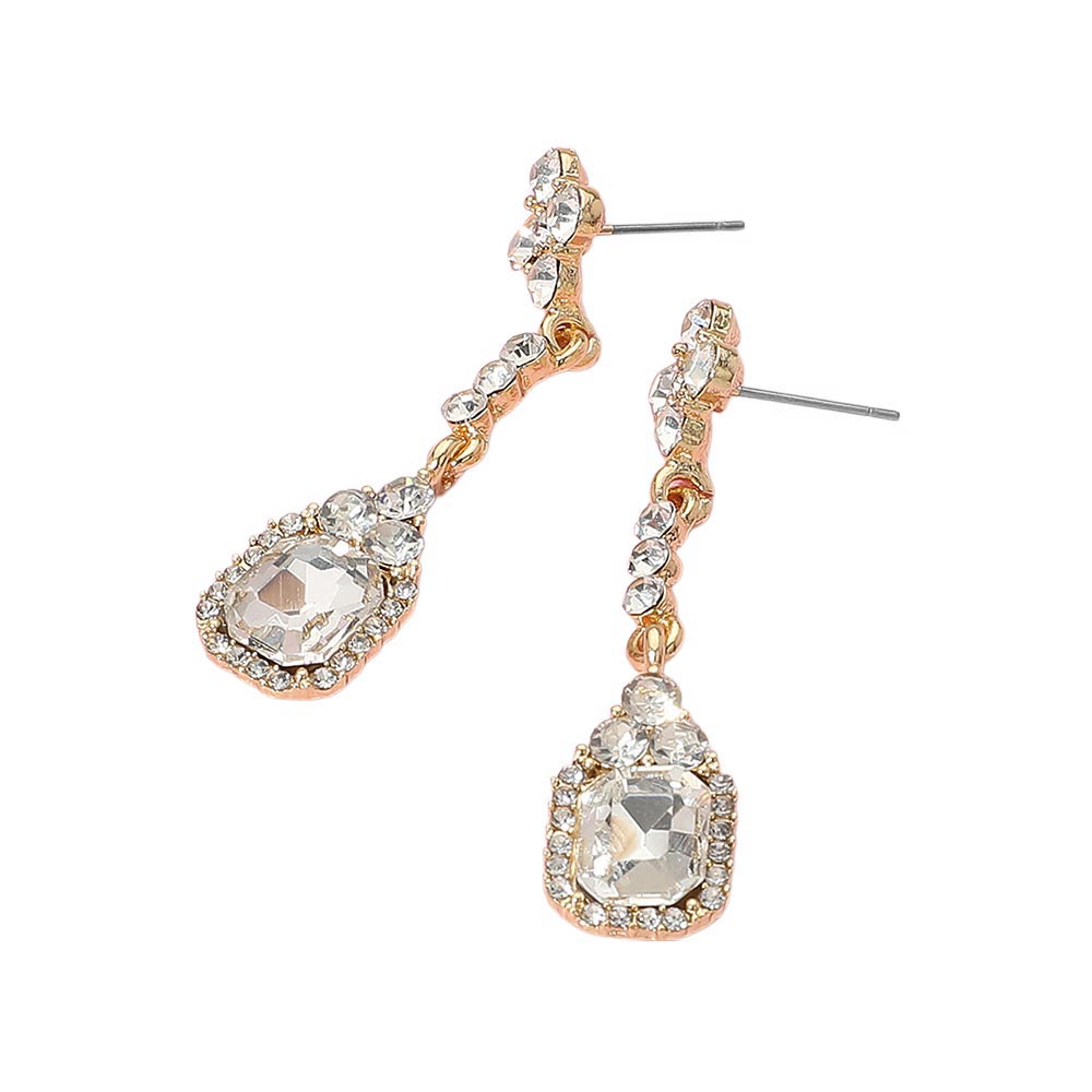 Details • Size : 0.5" X 2" • Post Back • Make a statement with these elegant dangle earrings featuring radiant rhinestone accents and a dazzling drop design. Perfect for evening events, weddings, or any special occasion where a touch of glamour is desired. • Lead and Nickel Compliant