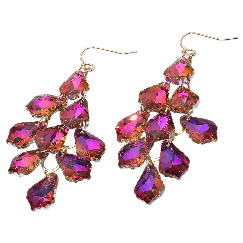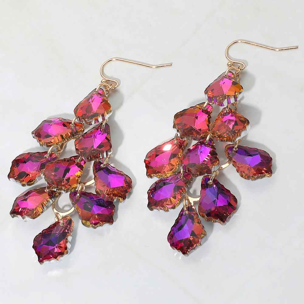Details • Size : 1.3" X 3" • Fish Hook Back • Striking dangle earrings featuring a cascading cluster of faceted teardrop shapes for bold movement and shimmer. Perfect for evening wear or dramatic daytime looks, these earrings add texture, depth, and a touch of elegance to any outfit with their layered silhouette. • Lead and Nickel Compliant