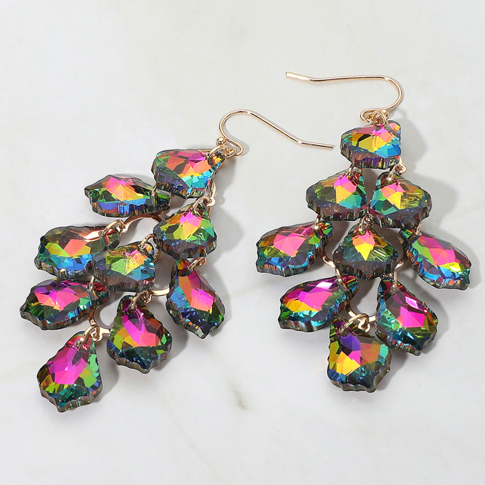 • Striking dangle earrings featuring a cascading cluster of faceted teardrop shapes for bold movement and shimmer. Perfect for evening wear or dramatic daytime looks, these earrings add texture, depth, and a touch of elegance to any outfit with their layered silhouette.