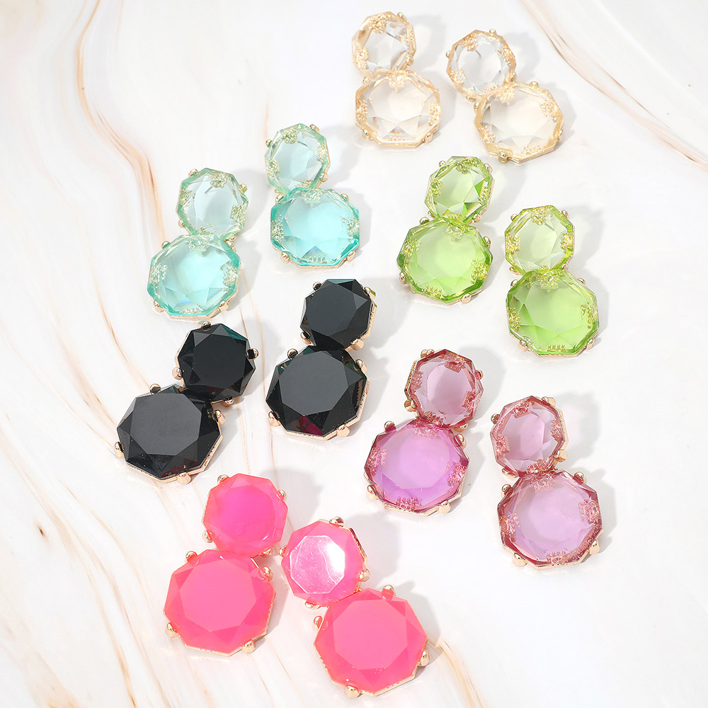 • These faceted double gem drop earrings feature a striking octagonal design that reflects light with every movement. Their elegant, layered silhouette adds a refined touch, making them a standout accessory for both casual and formal occasions.