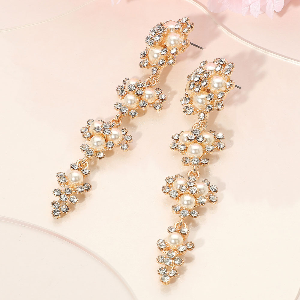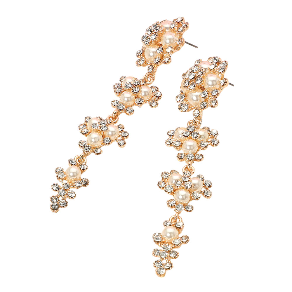 Details • Size : 1" X 3.8" • Post Back • Stunning floral drop earrings featuring layered pearls and sparkling rhinestones. Lightweight yet bold design perfect for weddings, parties, or elevating everyday outfits. Comfortable post-back fit. • Lead and Nickel Compliant