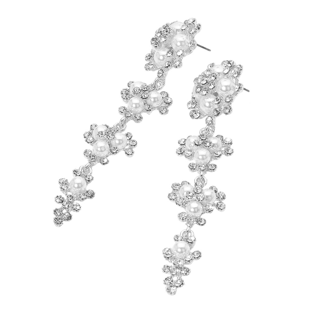 Details • Size : 1" X 3.8" • Post Back • Stunning floral drop earrings featuring layered pearls and sparkling rhinestones. Lightweight yet bold design perfect for weddings, parties, or elevating everyday outfits. Comfortable post-back fit. • Lead and Nickel Compliant