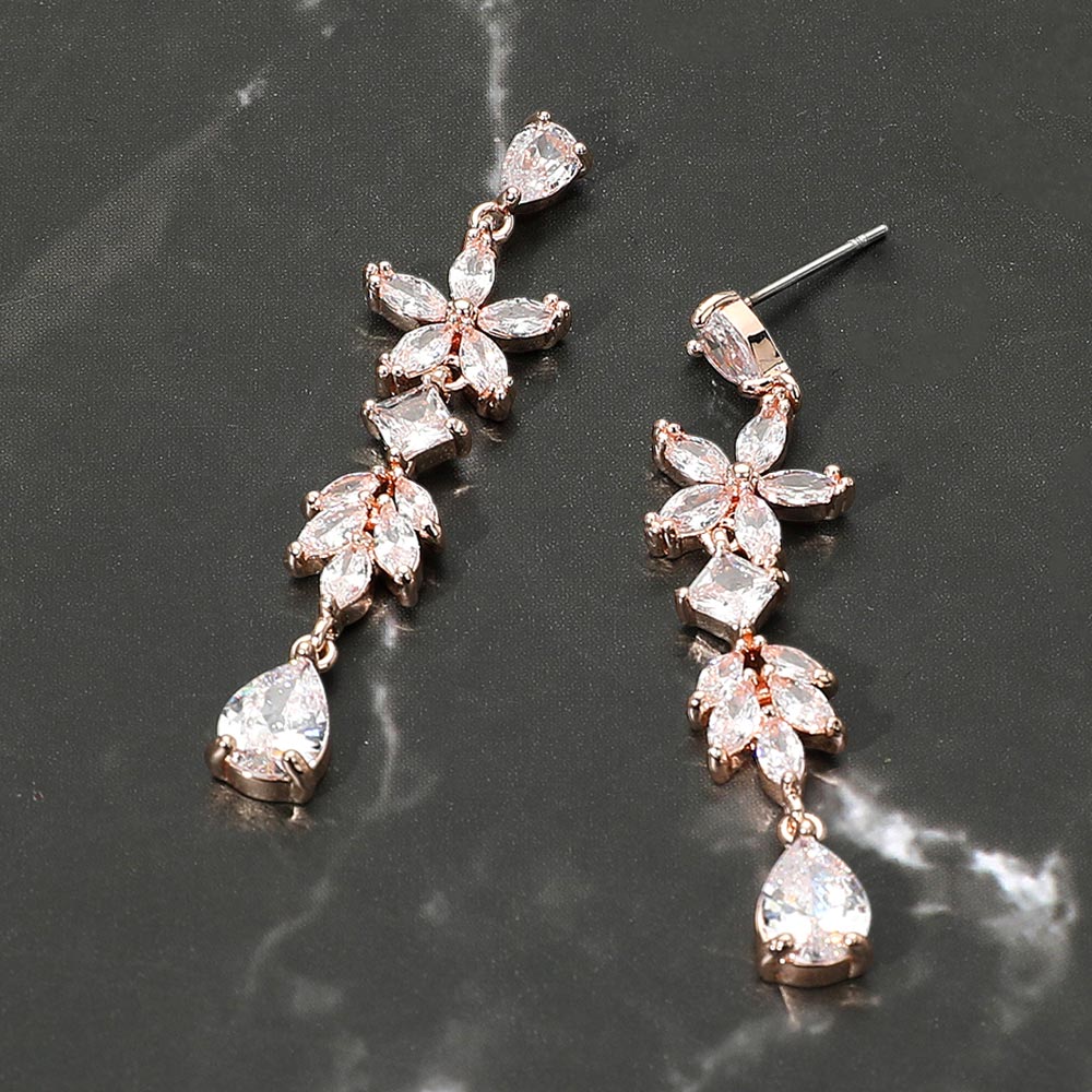 • These cubic zirconia floral dangle earrings showcase a graceful arrangement of shimmering stones in a delicate floral design. Their refined drop style captures light beautifully, adding an elegant sparkle that enhances both formal attire and sophisticated everyday looks.